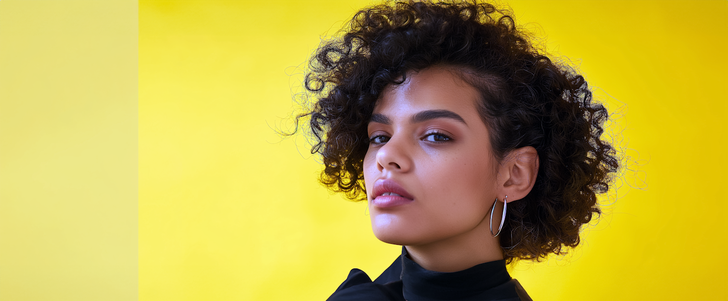 Confident woman with curly hair and hoop earrings against a vibrant yellow background, exuding elegance and style.