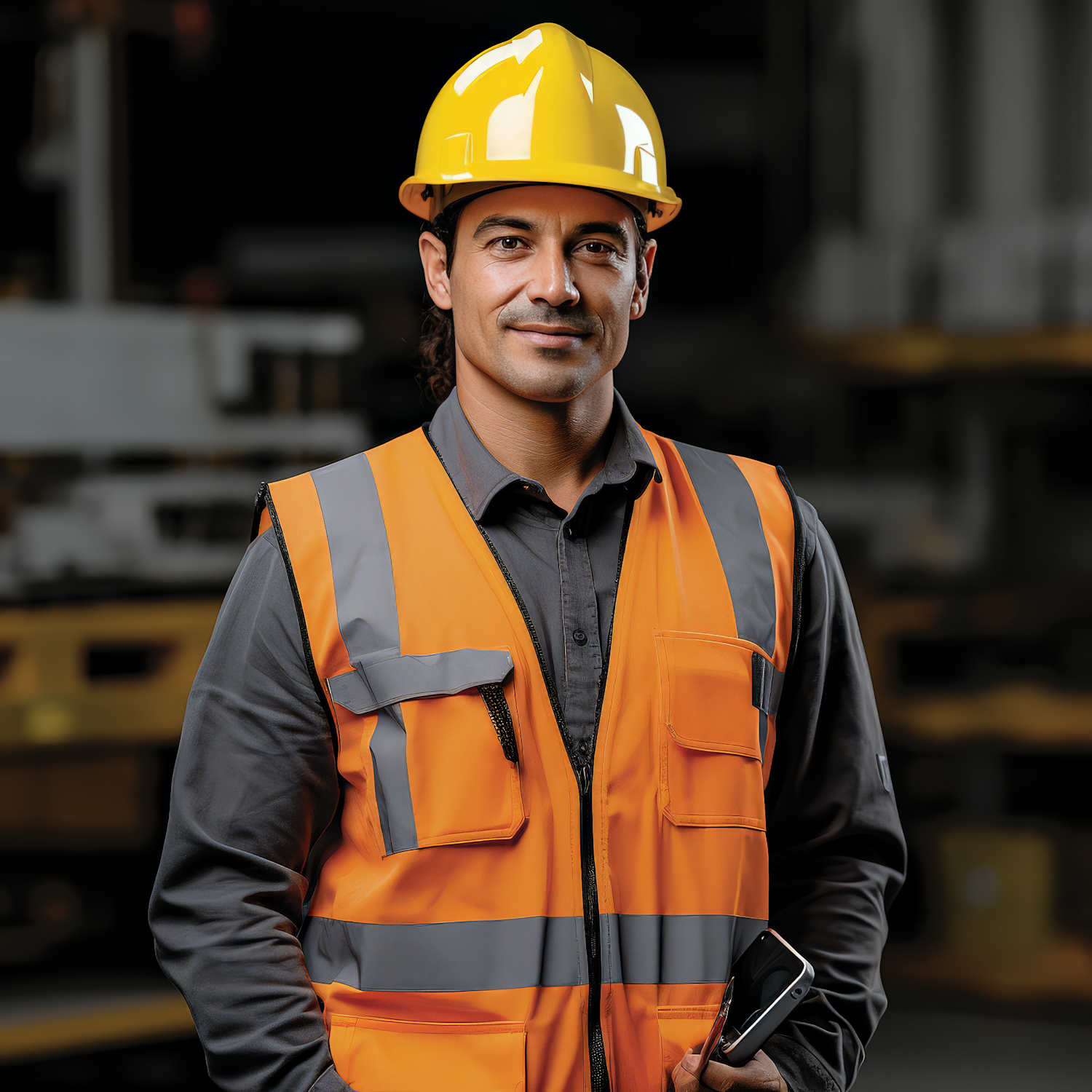 Man in safety gear with yellow hard hat and orange vest in industrial setting, holding a smartphone, exuding confidence.