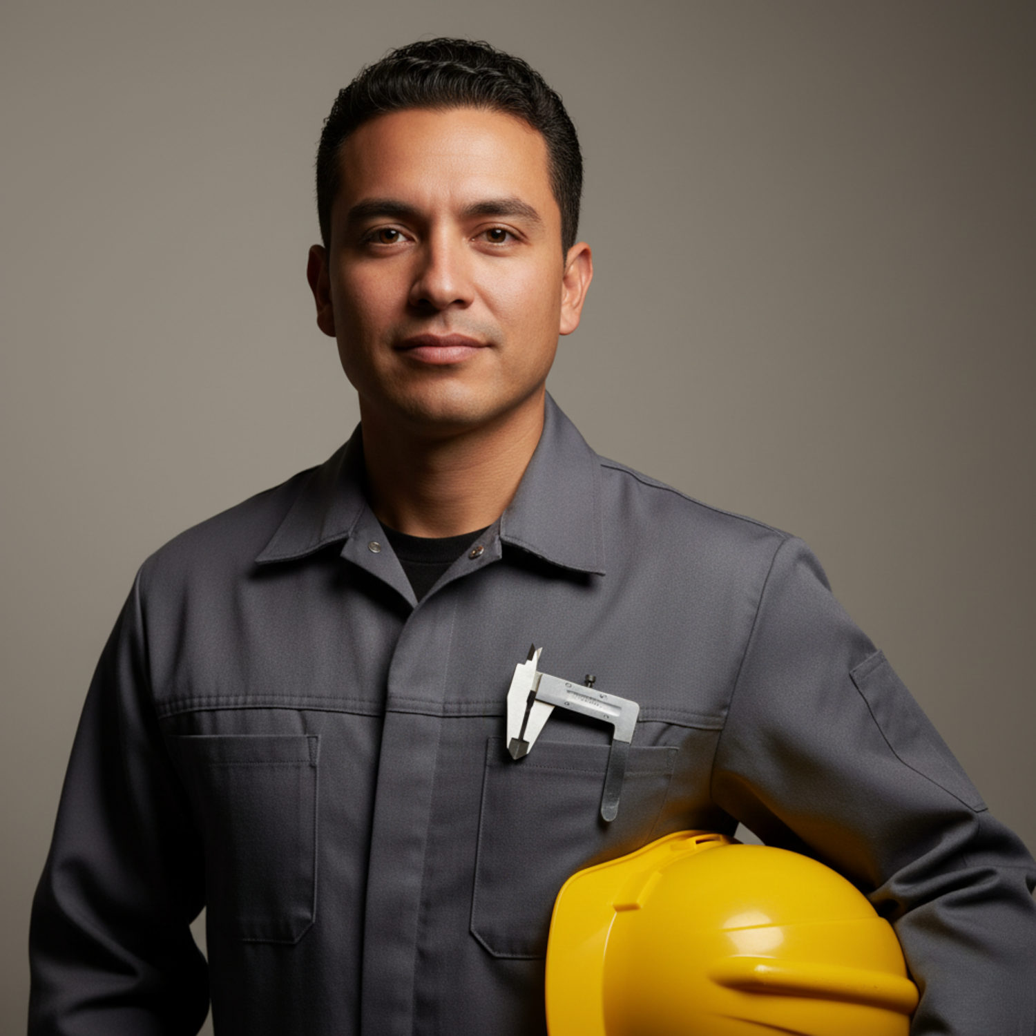A professional worker in a gray uniform holding a yellow hard hat, with a caliper tool in his pocket, against a neutral background.