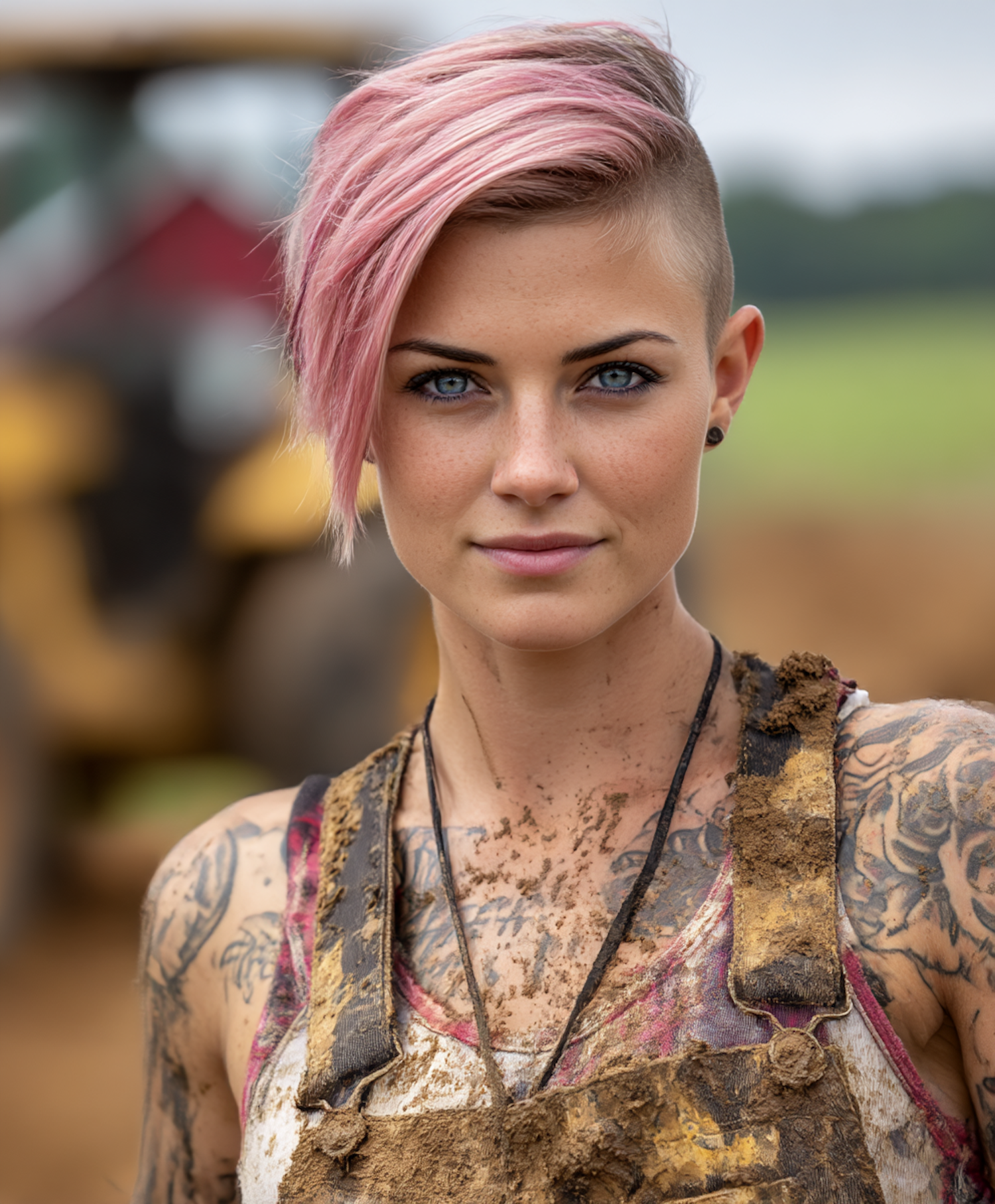 A confident woman with pink hair and tattoos, wearing muddy overalls, stands outdoors near construction equipment.