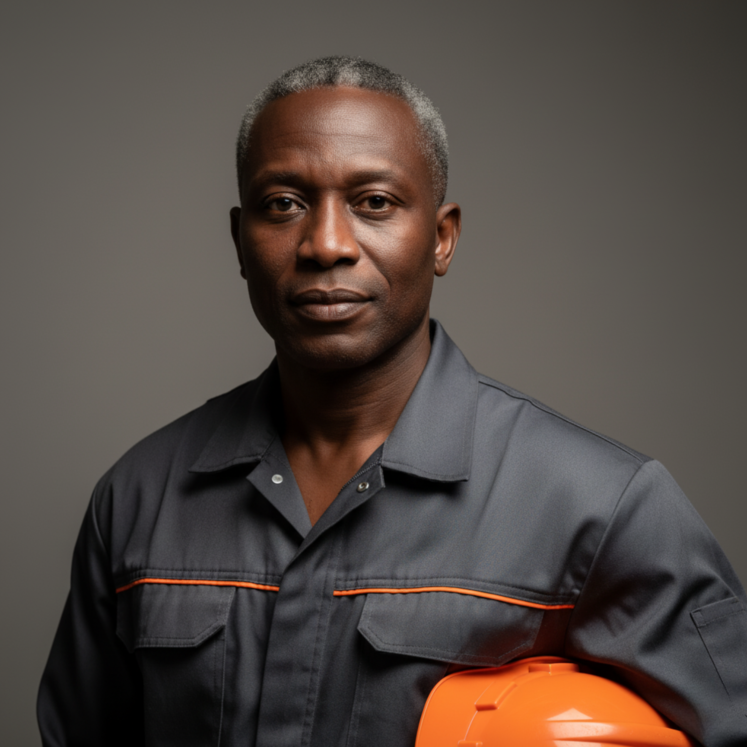 Portrait of a man in a work uniform holding a safety helmet, showcasing professionalism and readiness in a neutral studio setting.