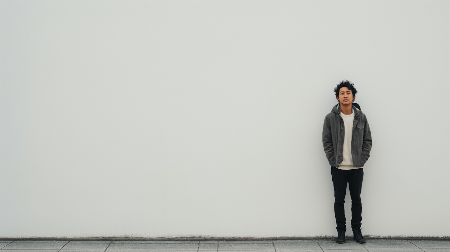 Young Asian man in casual attire stands against a minimalist white wall, creating a striking visual contrast.