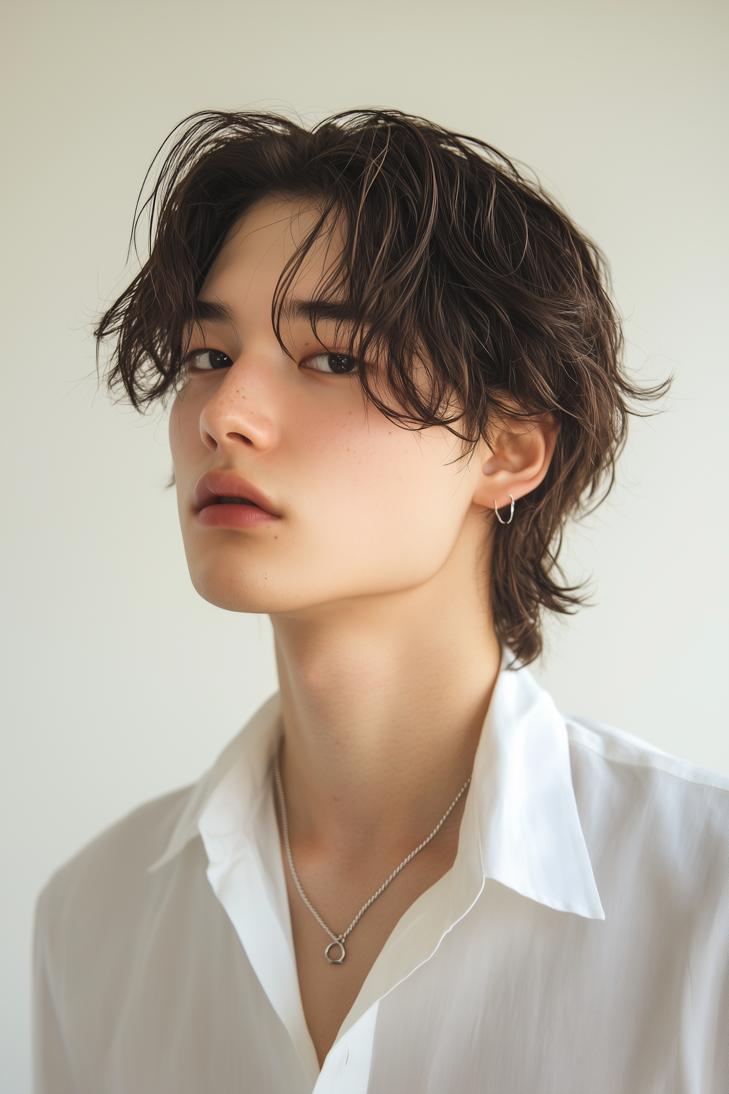 Stylish young man with wavy dark hair, white shirt, and silver jewelry, posing against a minimal background.