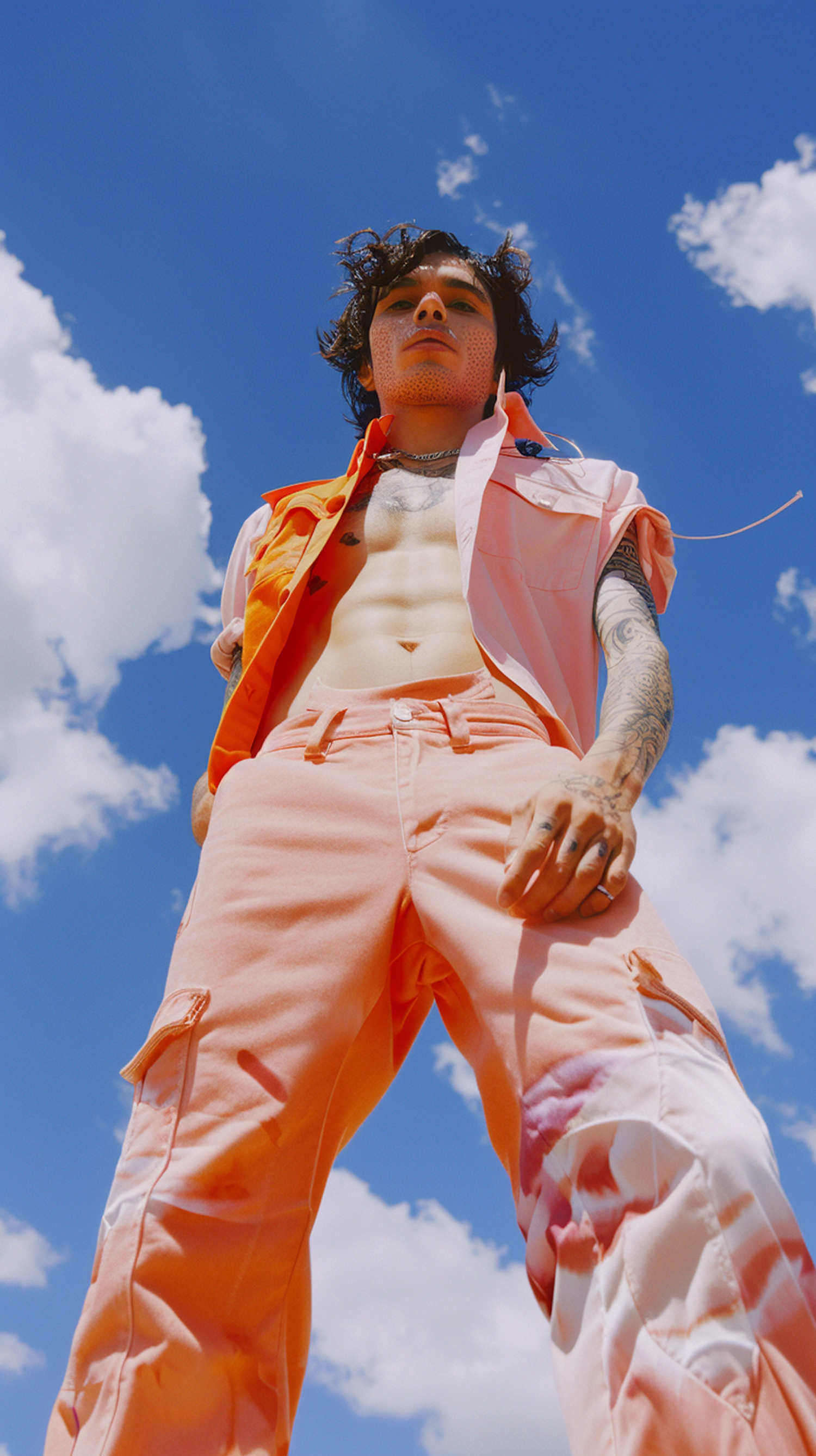 Confident young man in pink outfit stands against a vibrant blue sky, showcasing tattoos and a toned physique.
