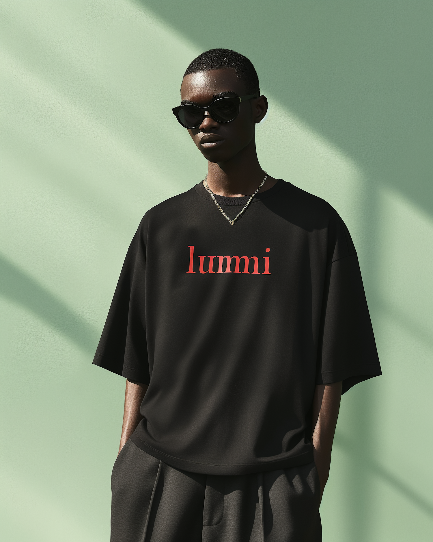 Stylish Black man in sunglasses and 'lumni' t-shirt against a green background, exuding modern fashion and elegance.
