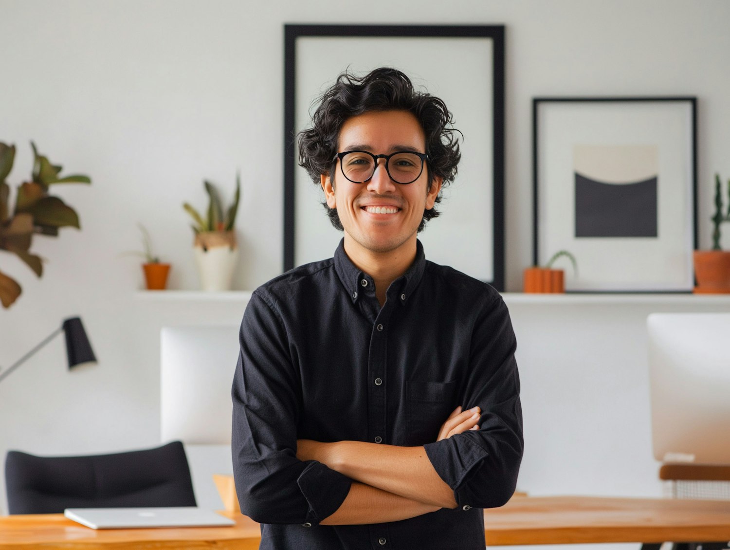 Smiling young man with glasses in a modern office setting, featuring minimalist decor and potted plants.