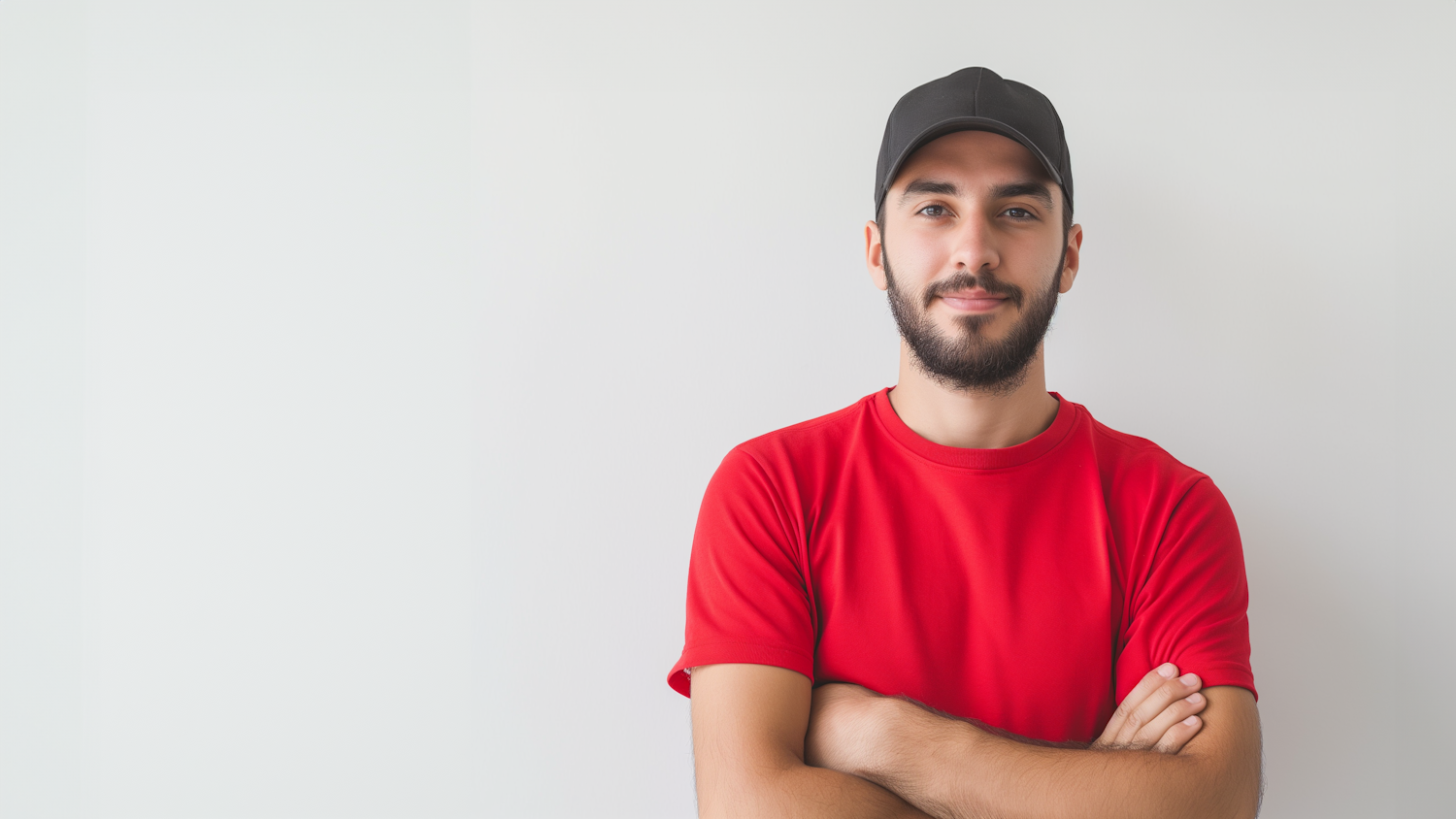 Confident young man in a red t-shirt and black cap, standing with arms crossed against a plain white background.