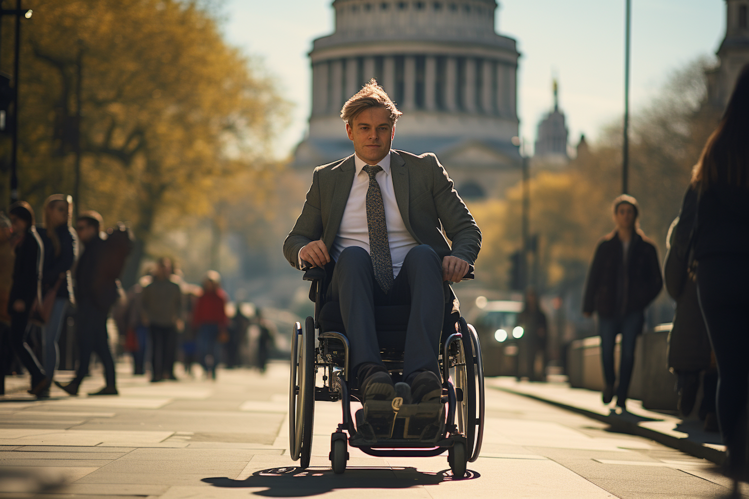 Confident man in a wheelchair navigating a busy city street with a domed building in the background on a sunny day.