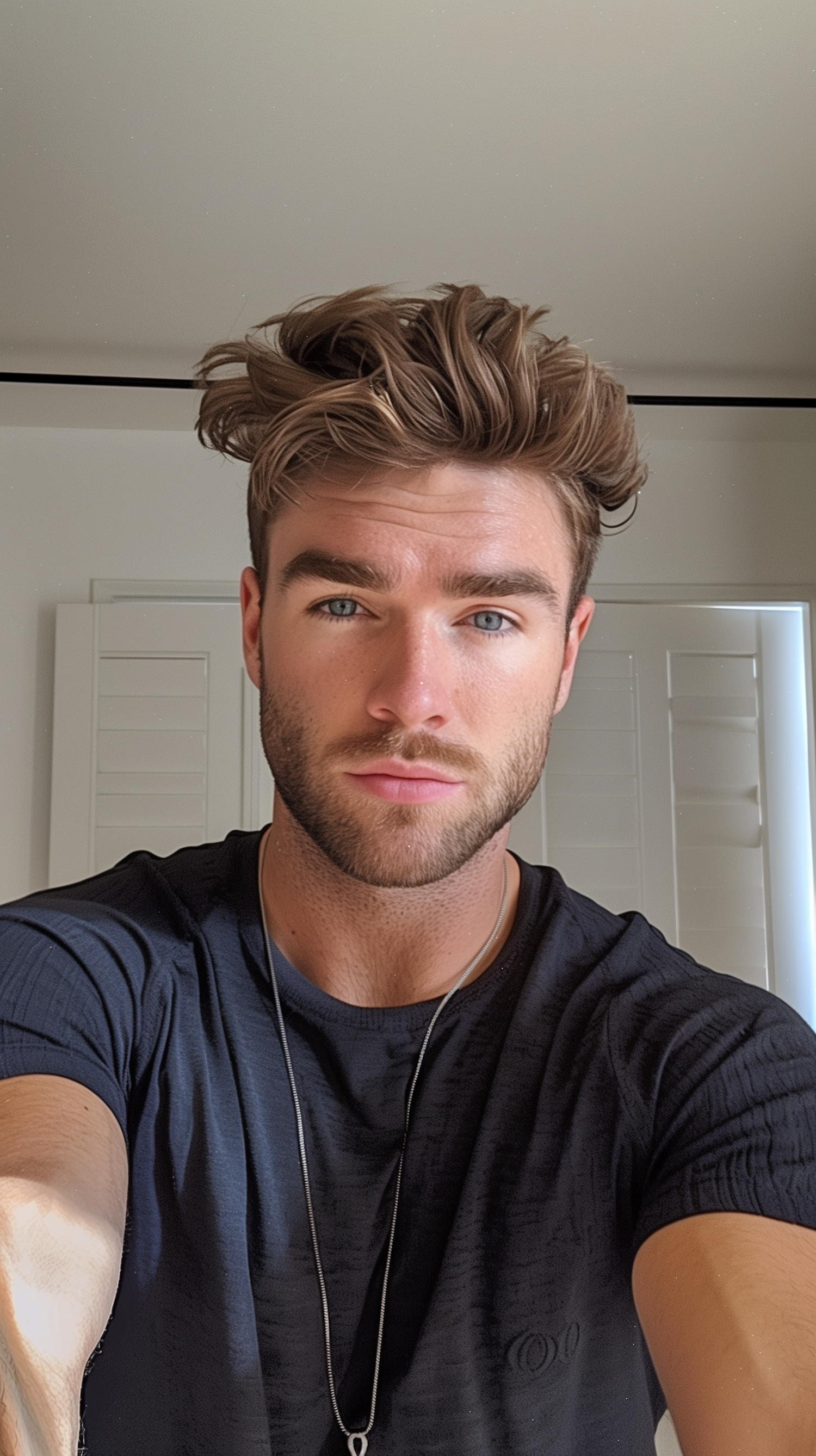 Young man with tousled brown hair and blue eyes, wearing a dark T-shirt and necklace, poses confidently against a neutral background.