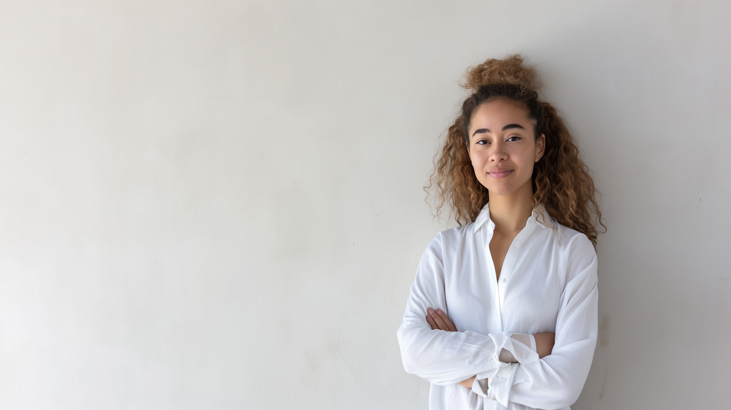 Confident young woman with curly hair in a white shirt, standing against a plain background, exuding calm and assurance.