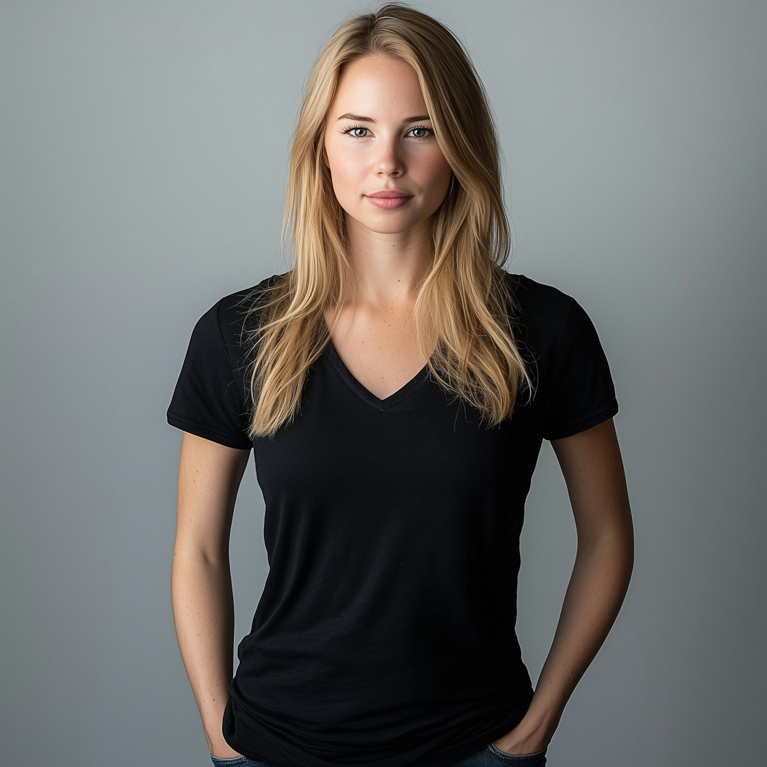 Blonde woman in a black V-neck T-shirt and jeans, standing confidently against a gray background with a relaxed and approachable vibe.