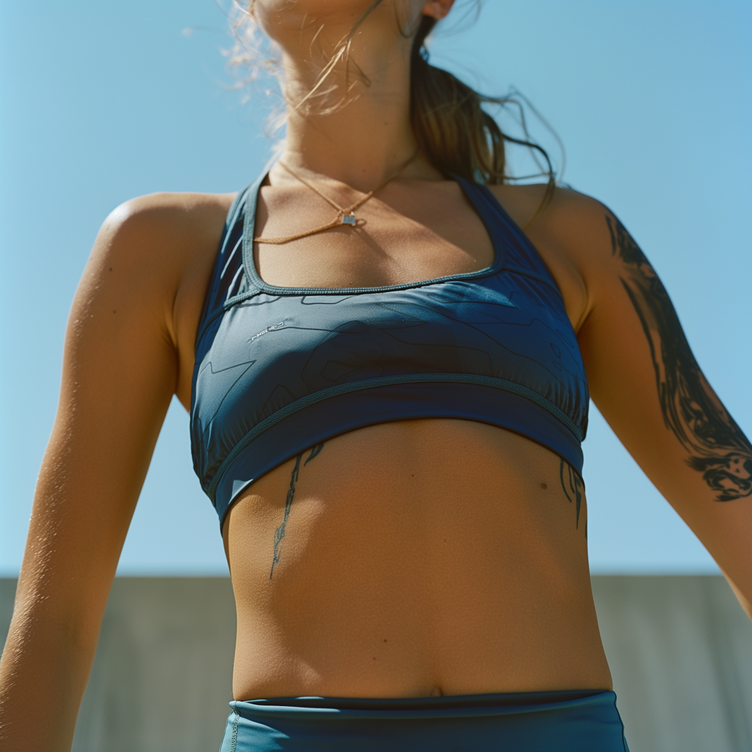 Athletic woman in a blue sports bra with a tattoo, under a clear blue sky, showcasing fitness and style.