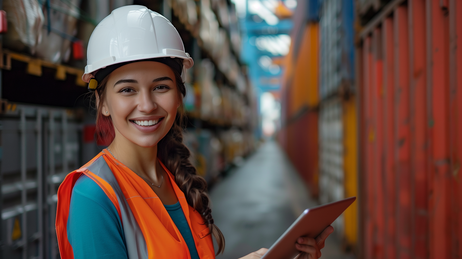 Smiling woman in a hard hat and safety vest holding a tablet in an industrial setting.