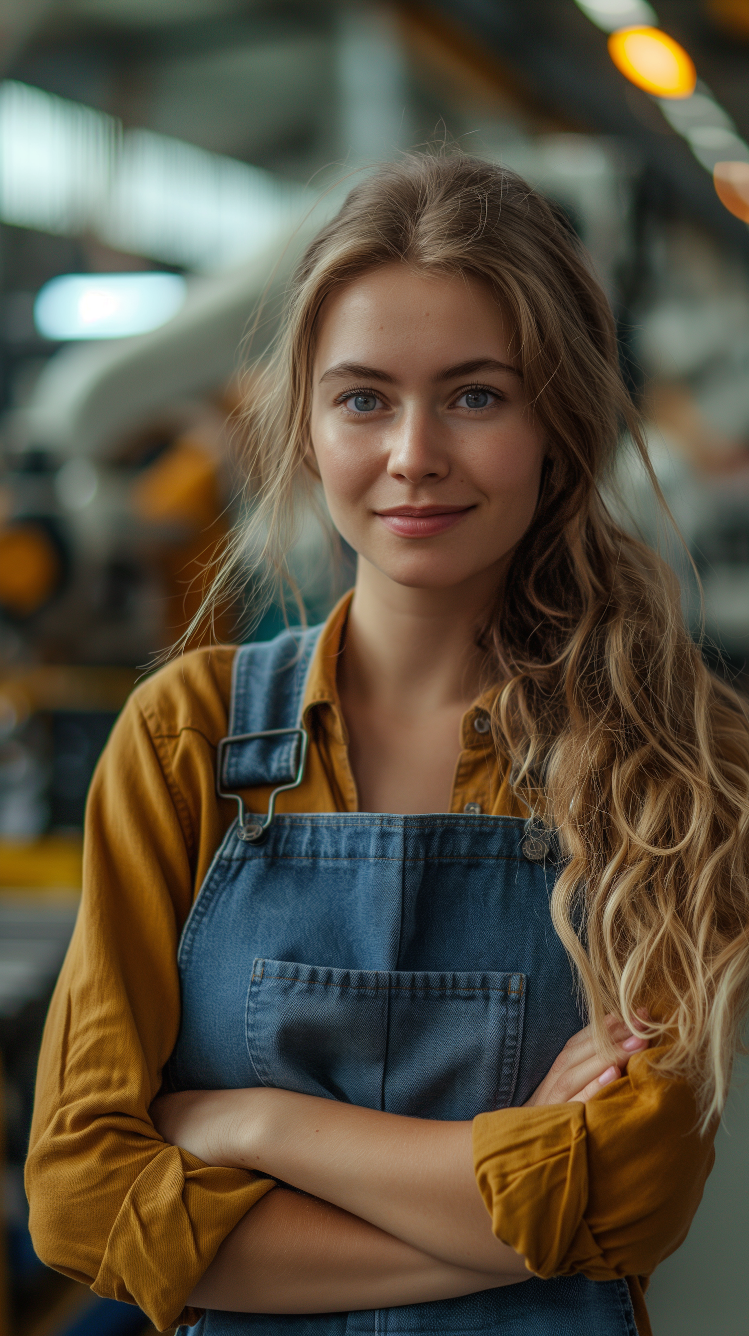 Confident young woman in denim overalls and mustard shirt, standing in a workshop with a warm smile and industrial background.