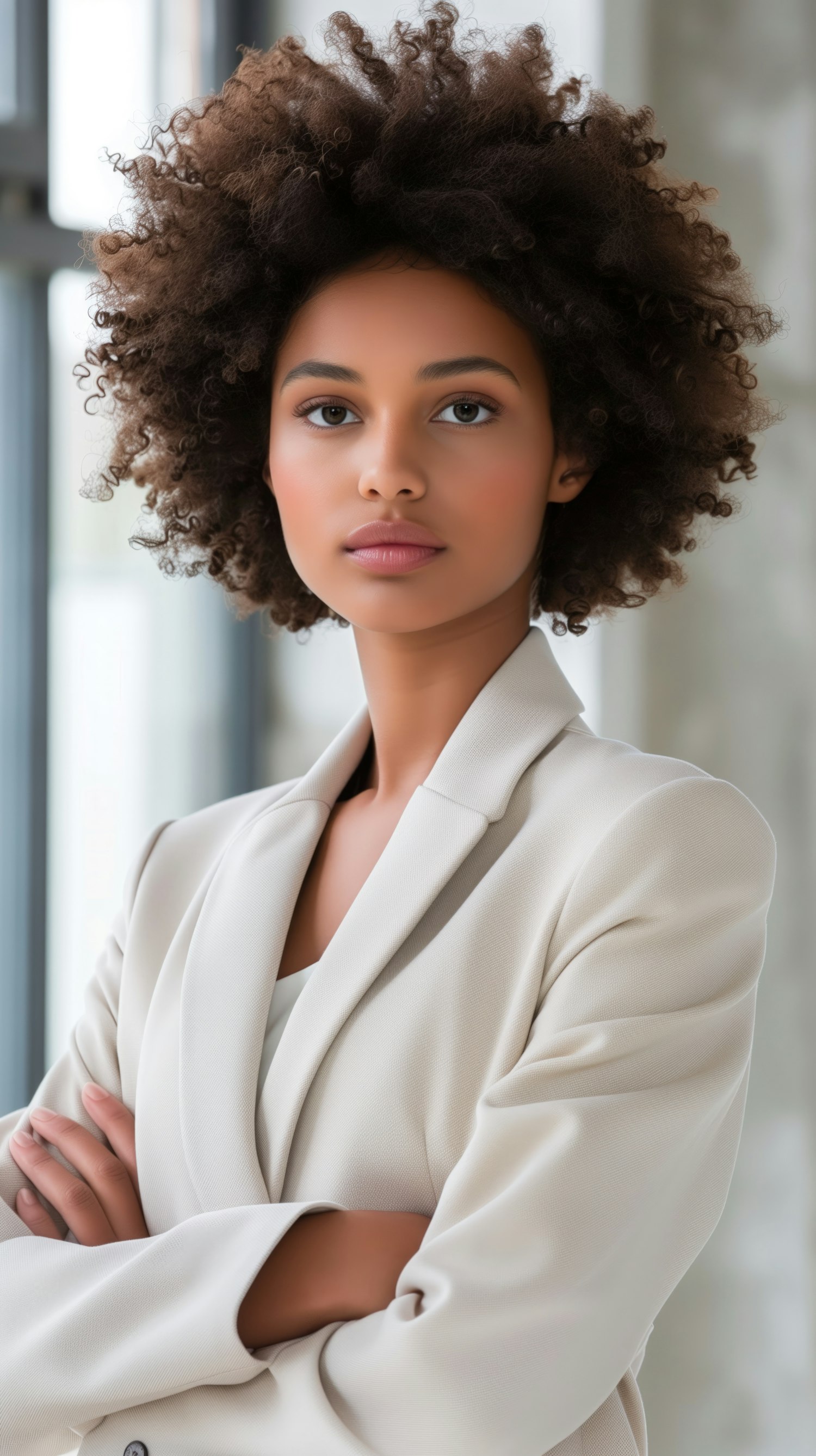 Confident young woman with afro hair in a beige blazer, exuding professionalism and poise against a softly blurred background.