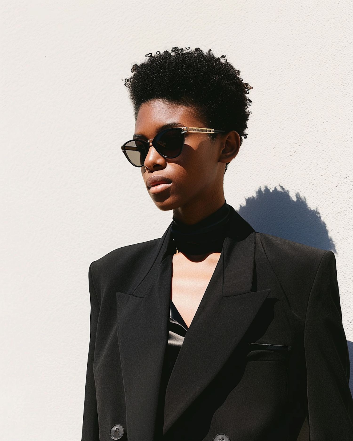 Stylish individual in black blazer and sunglasses against a white background, exuding modern elegance and sophistication.