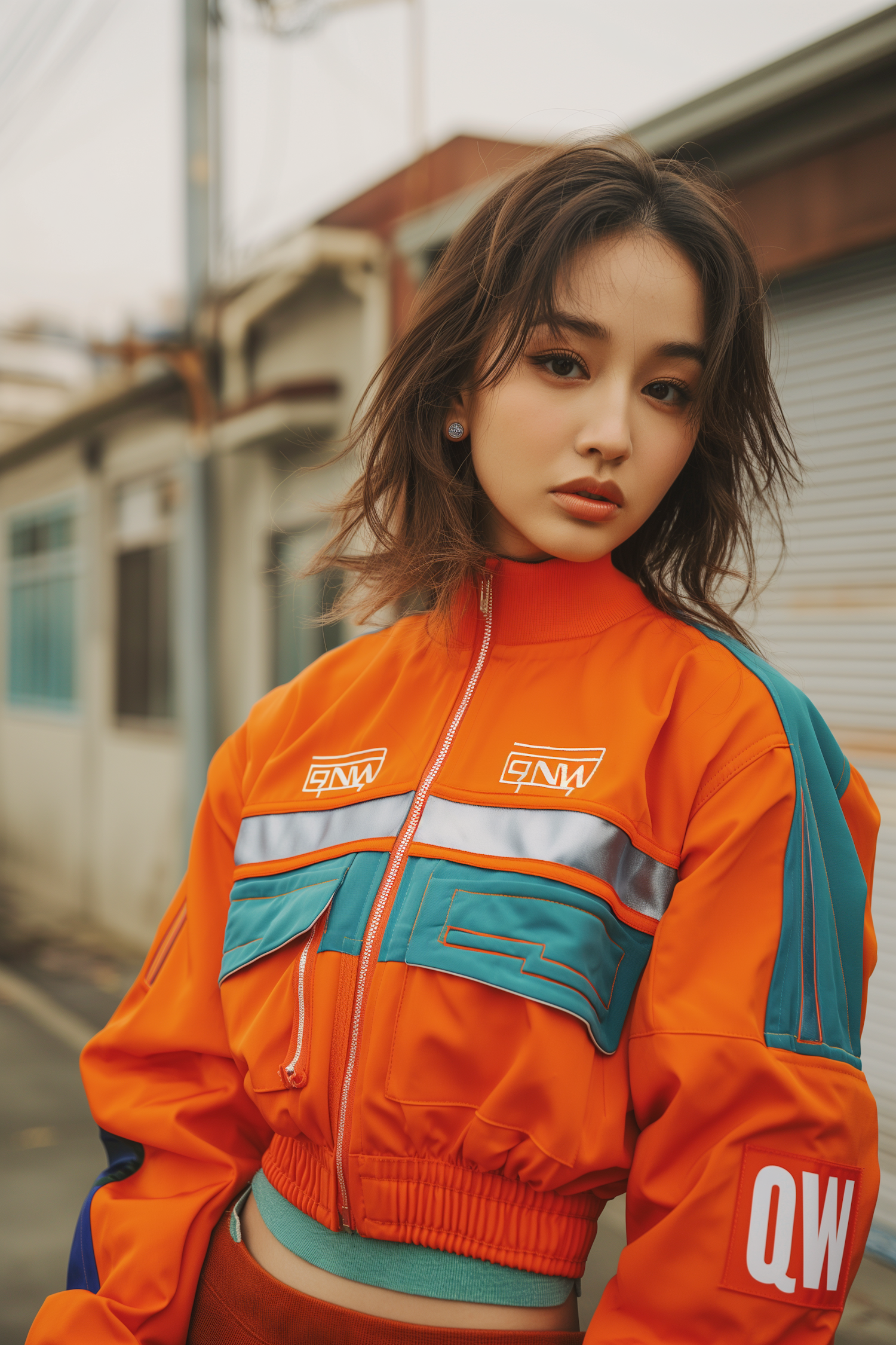 Stylish Asian woman in a vibrant orange and teal jacket poses confidently in an urban setting, showcasing modern street fashion.