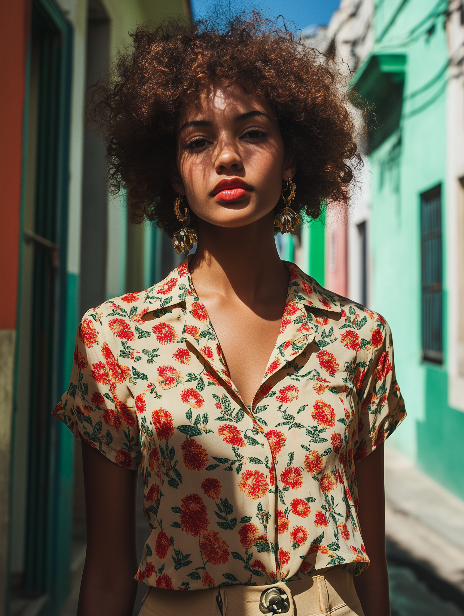 Stylish woman in floral blouse and bold earrings stands in a sunlit street with colorful buildings, exuding confidence and elegance.