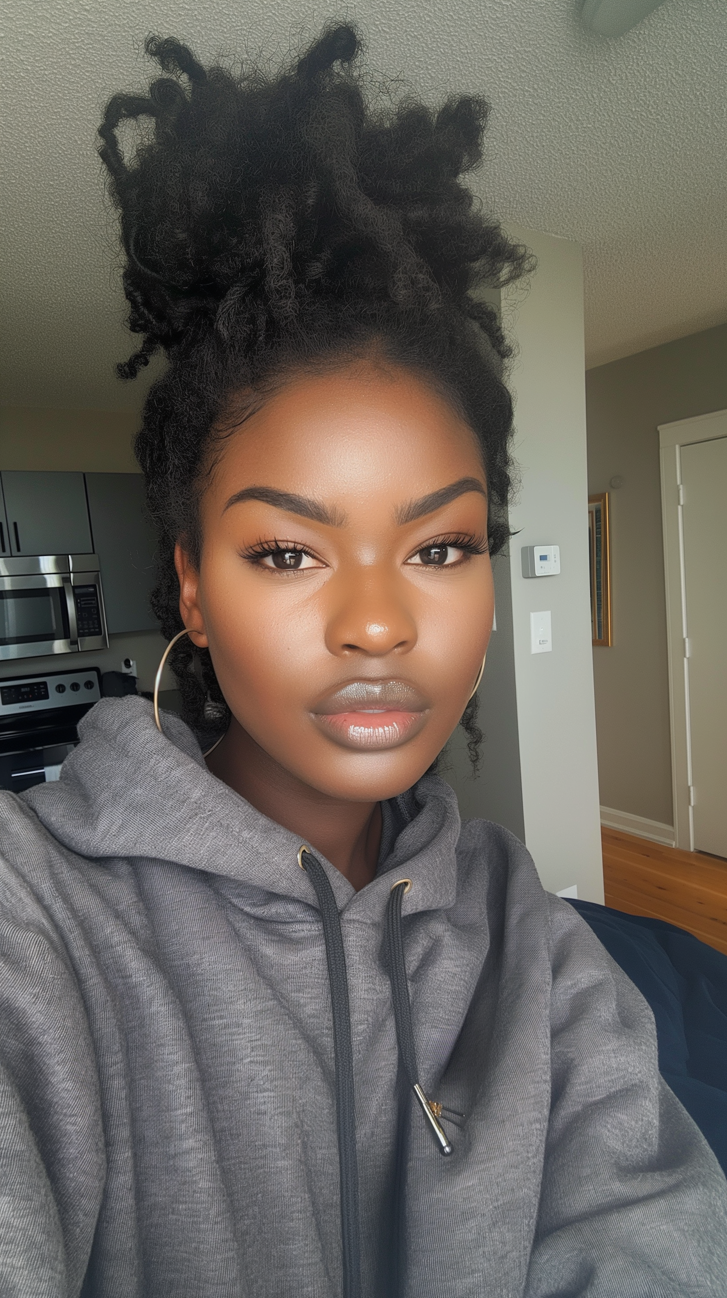Confident young woman with natural curls and hoop earrings in a modern kitchen setting, wearing a casual gray hoodie.