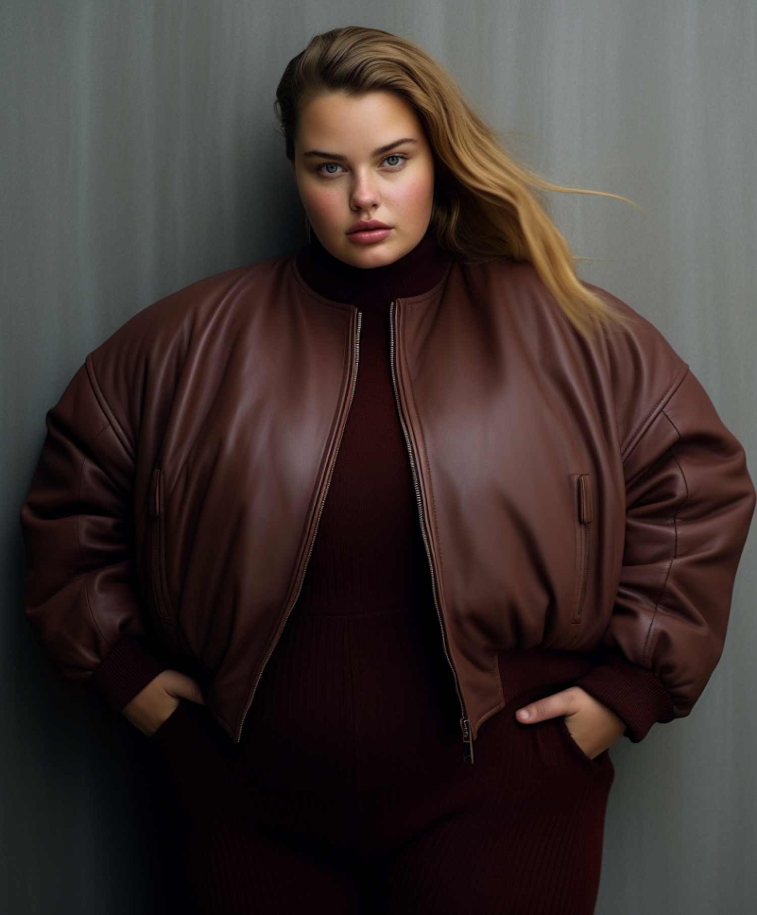 Confident woman in a brown leather jacket with striking blue eyes, exuding modern style and sophistication.