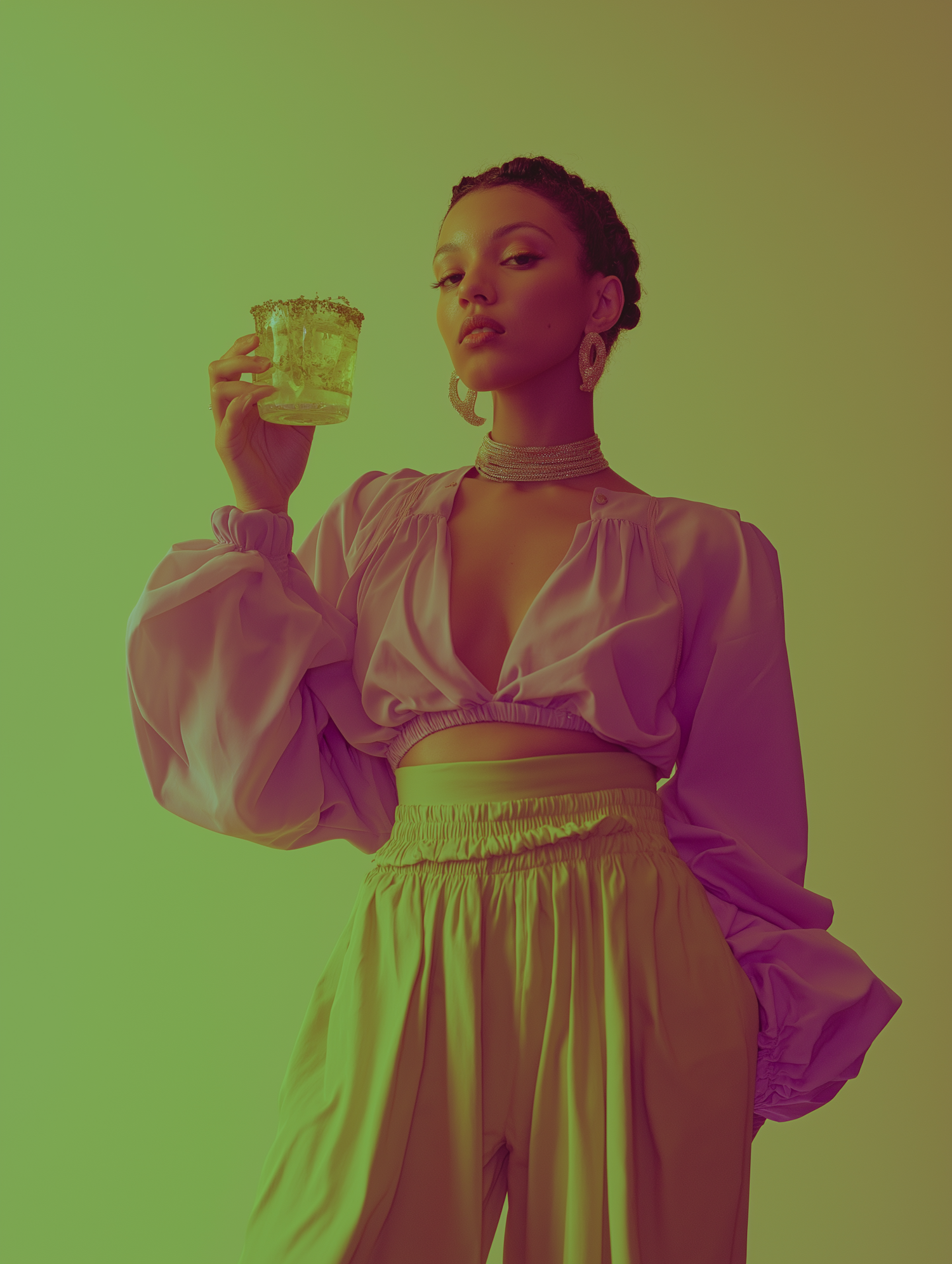 Stylish woman in lavender blouse and yellow pants holding a drink, set against a green-yellow gradient background.