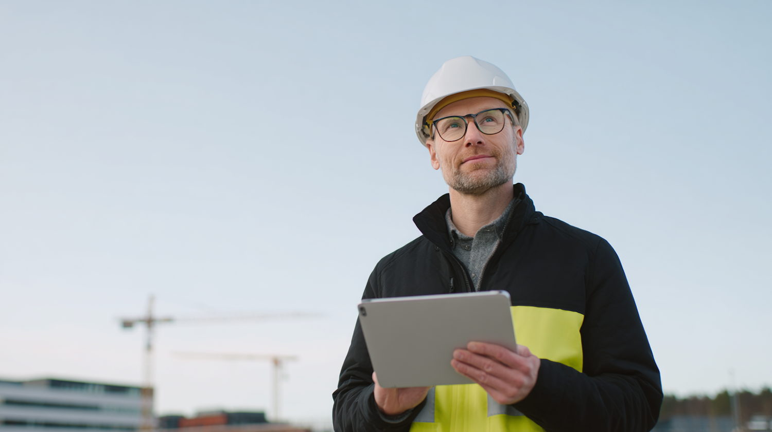 A construction professional in safety gear holding a tablet, standing outdoors with cranes in the background.