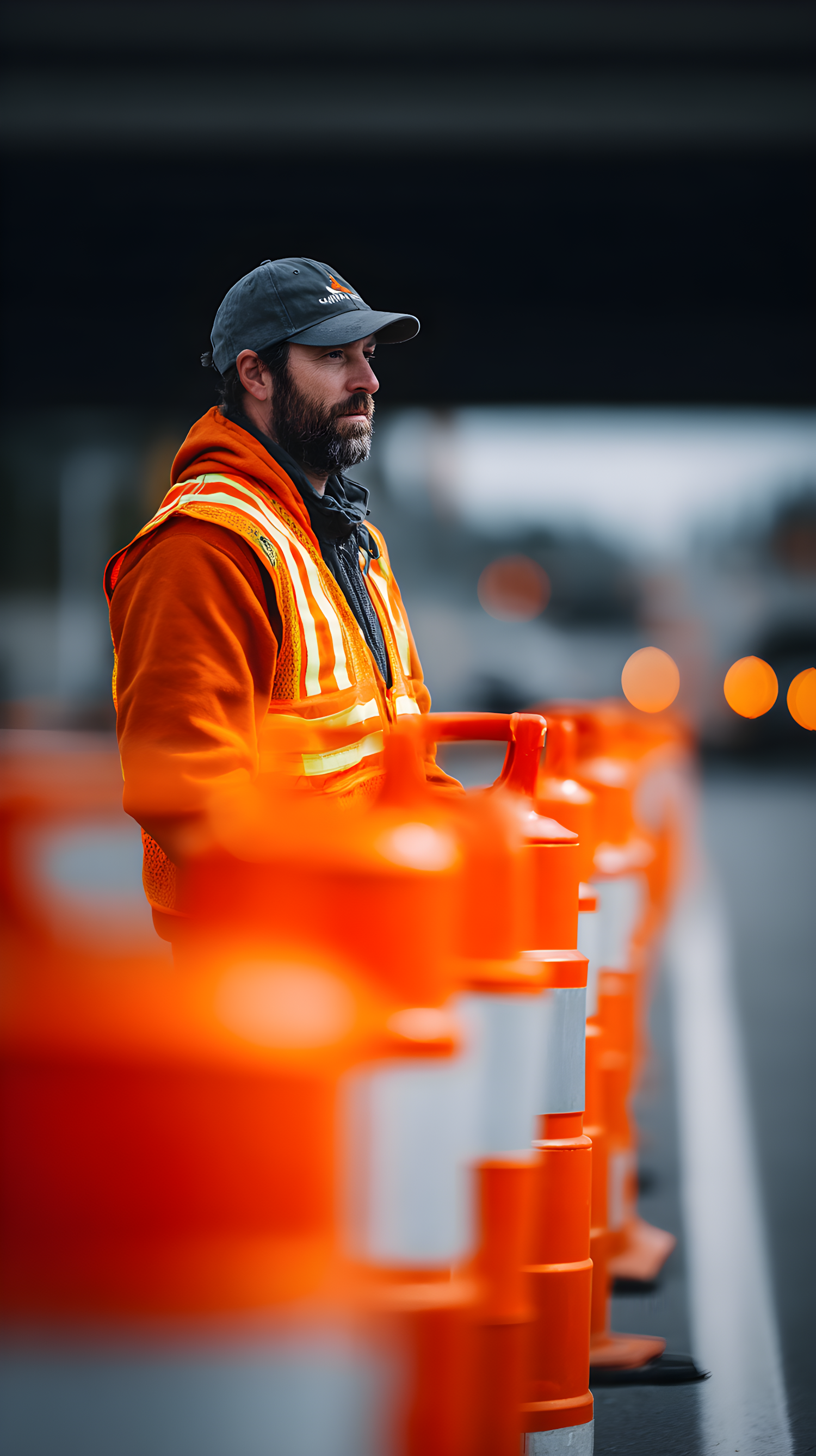 A worker in a reflective vest stands near bright orange traffic cones, overseeing a roadwork site with a focused expression.