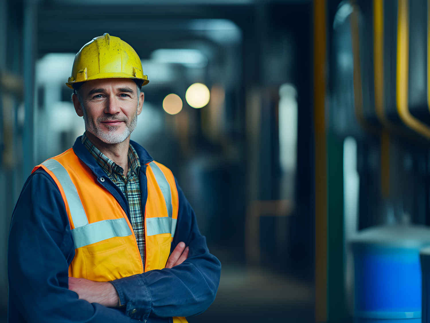 Confident middle-aged man in safety gear with a hard hat, standing in an industrial setting, exuding professionalism and experience.