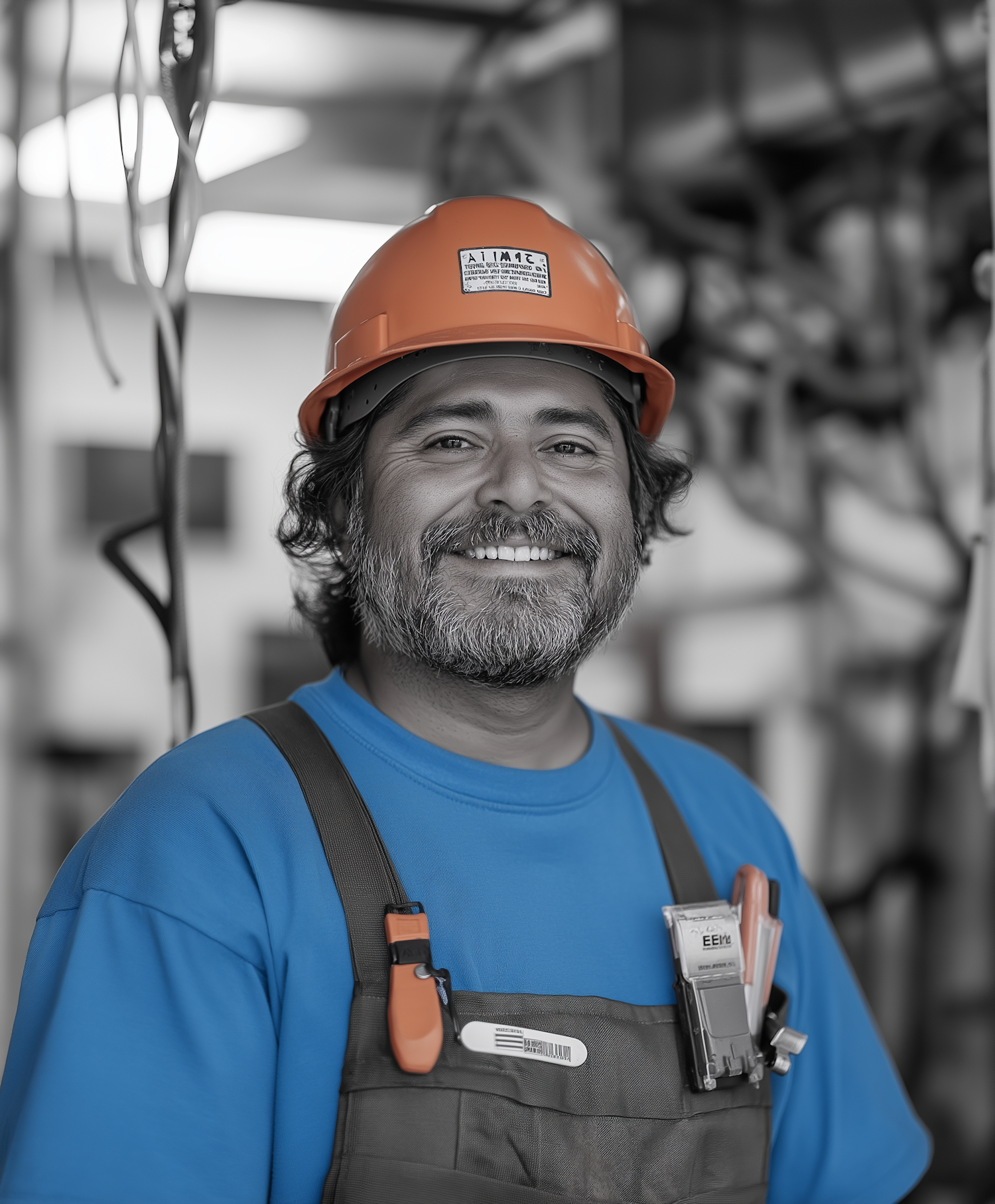 Smiling worker in orange hard hat and blue shirt, standing in an industrial setting with tools clipped to his vest.