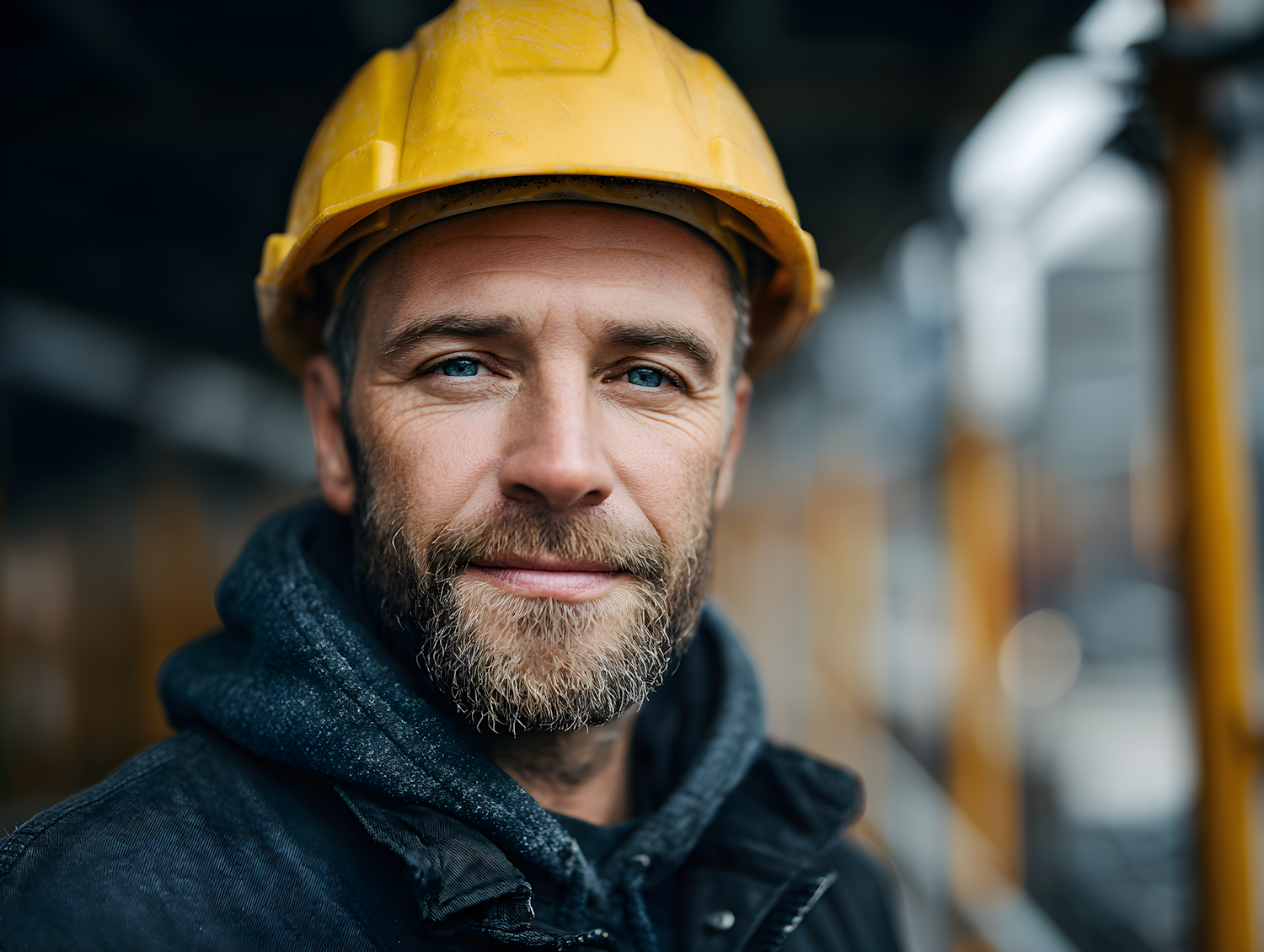 Close-up of a construction worker with a yellow helmet, blue eyes, and a beard, standing in an industrial setting.