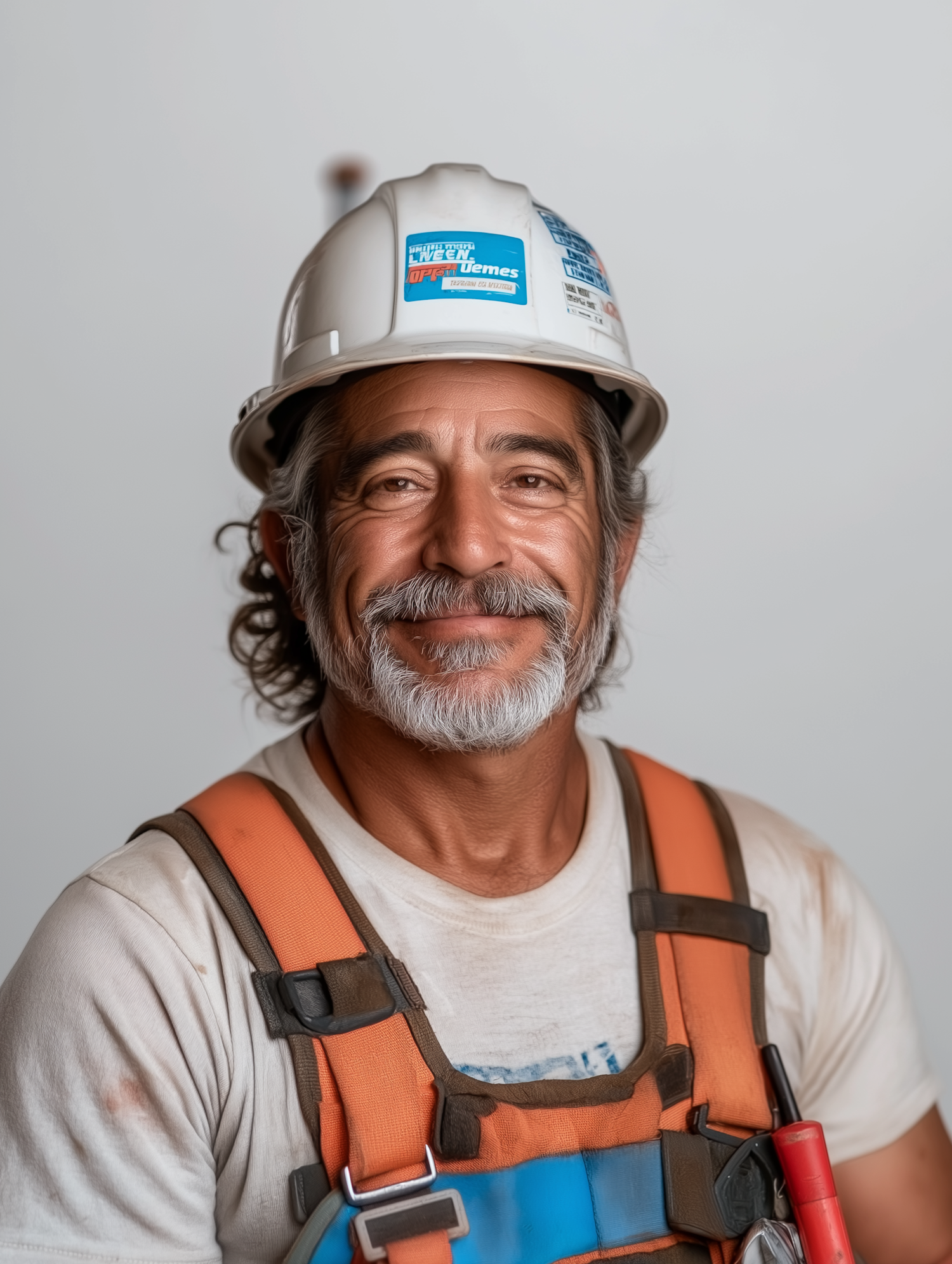 Smiling construction worker with a white helmet and safety harness, showcasing pride and confidence in his work.
