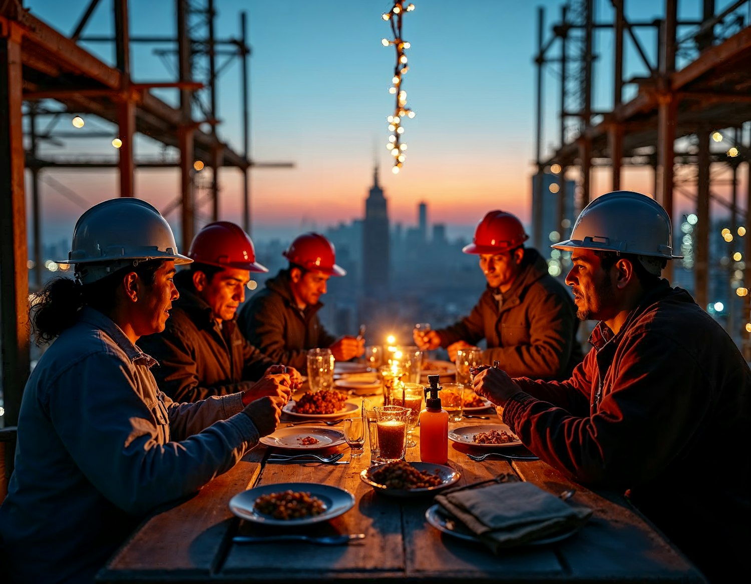 Construction workers share a meal at sunset on a site, with city skyline and warm candlelight creating a cozy, communal atmosphere.