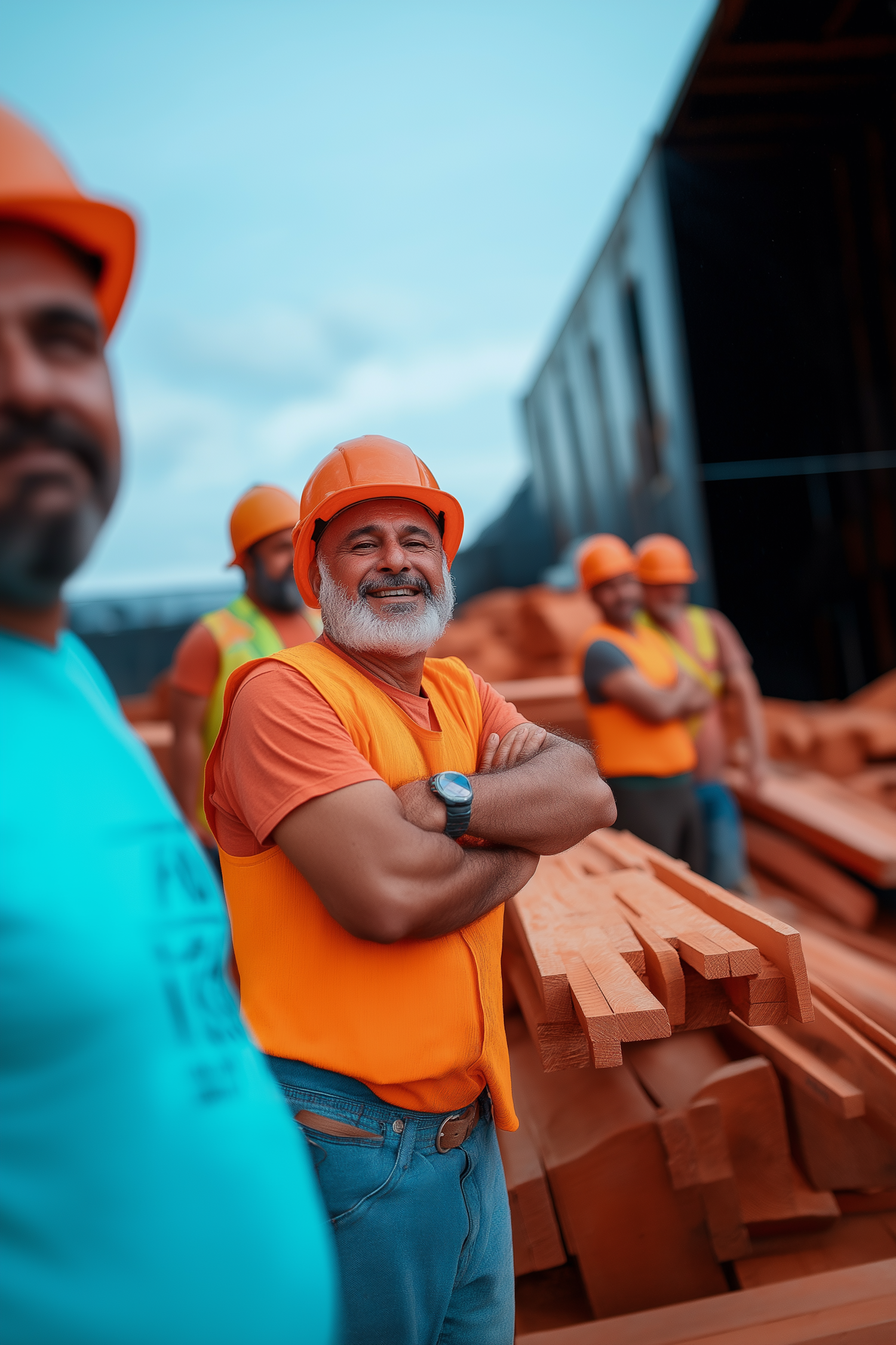 Confident construction worker in orange safety gear smiling, surrounded by colleagues and wooden planks at a worksite.