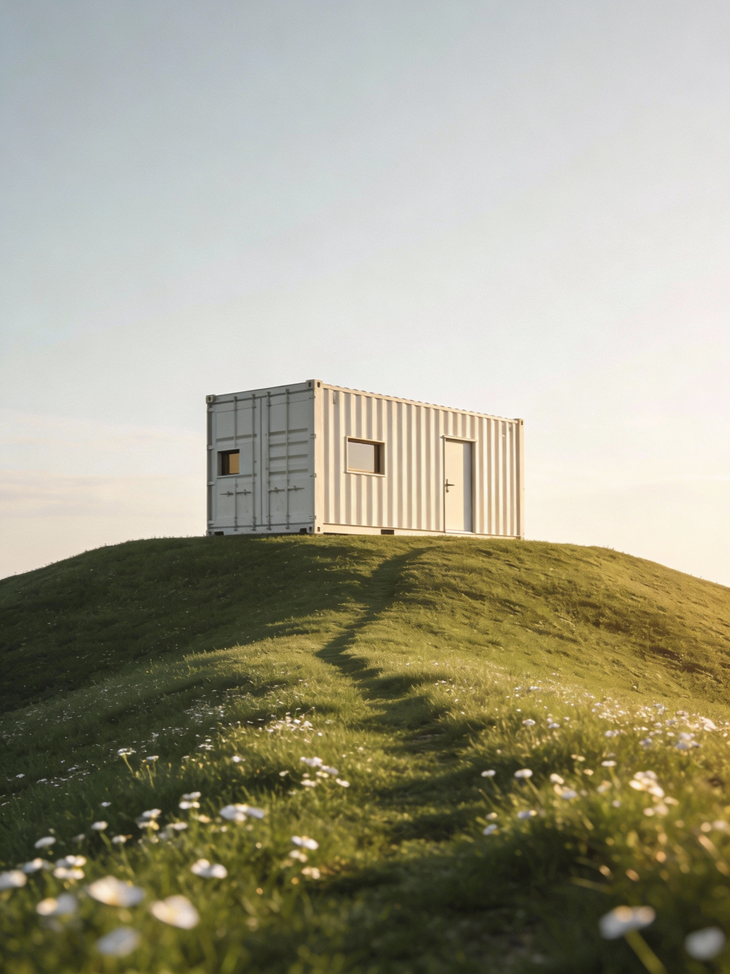 A white shipping container sits on a grassy hill with a dirt path leading to it, surrounded by flowers under a clear sky.