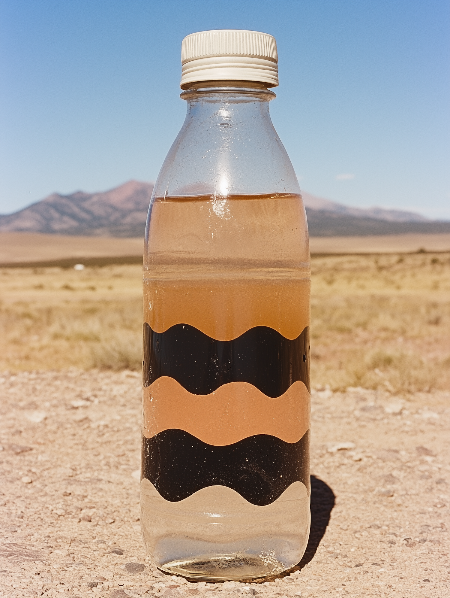 A plastic bottle with murky water sits on a dry landscape, featuring wavy stripe designs and a clear blue sky in the background.
