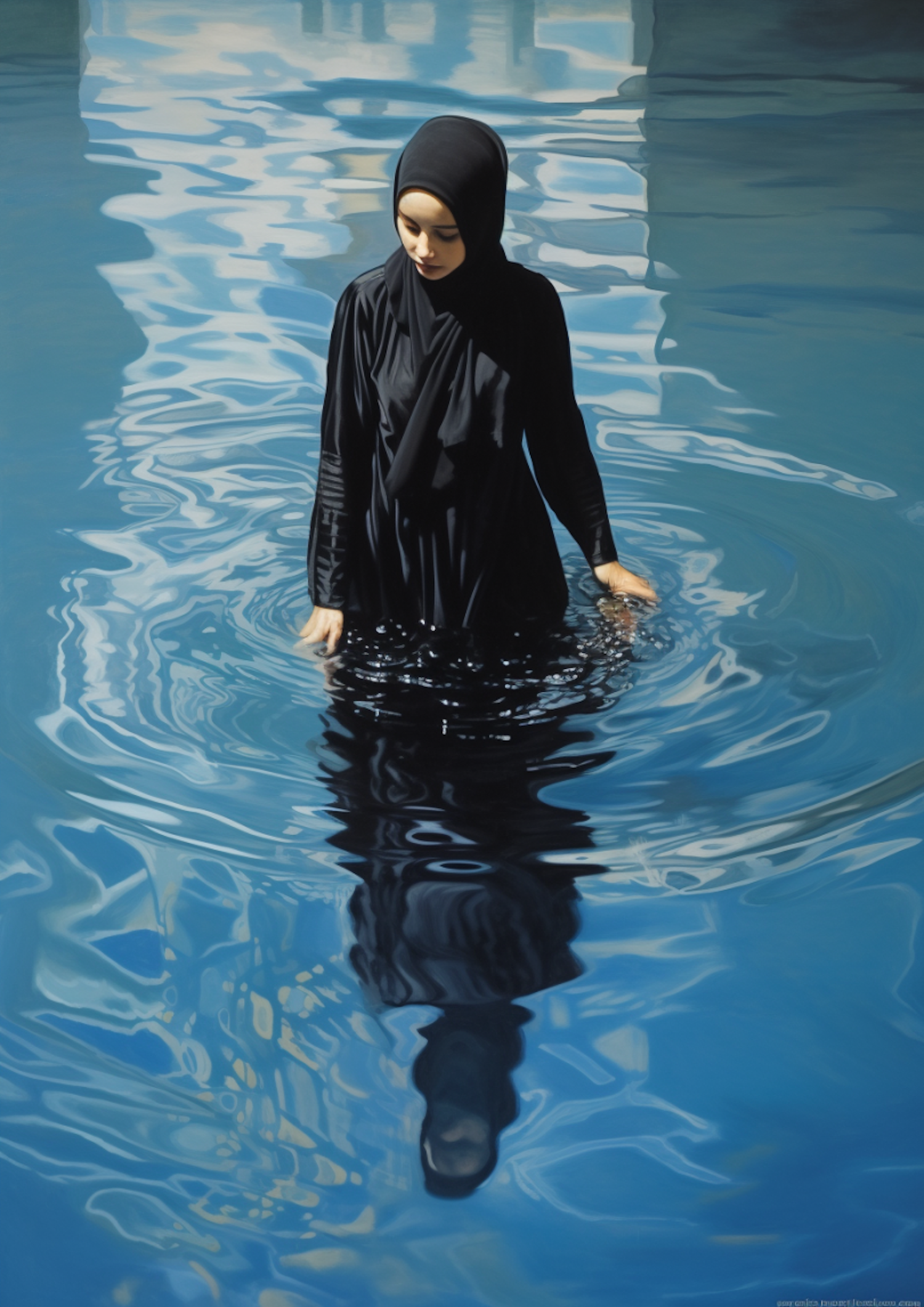 A woman in a black hijab stands in a blue pool, her reflection rippling in the water. The scene is serene and contemplative.