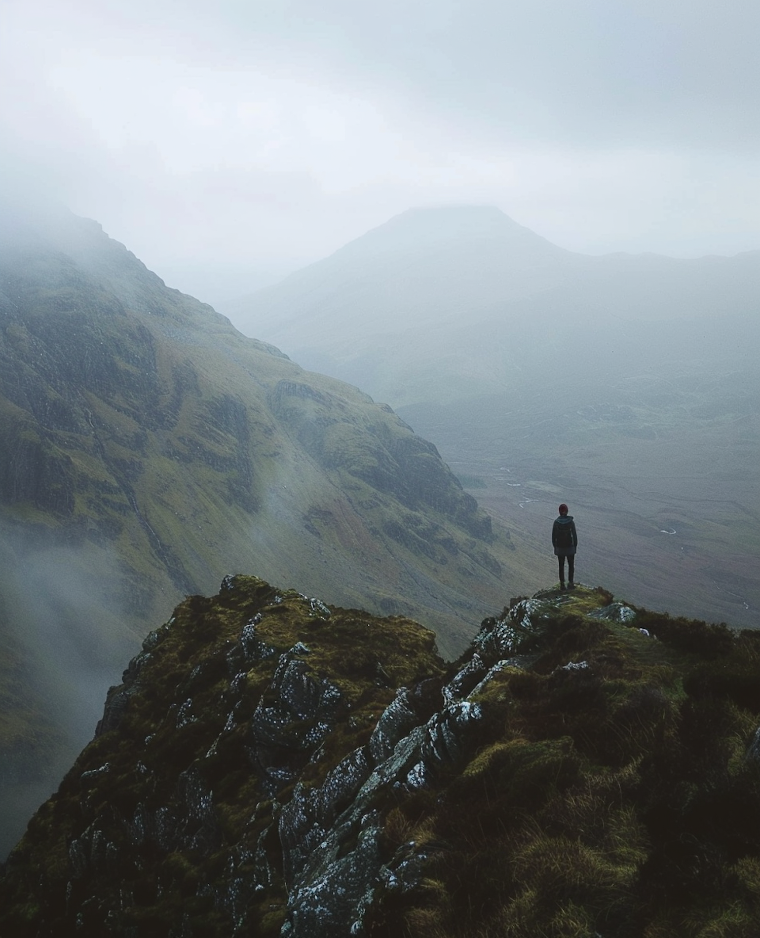 A lone hiker stands on a misty cliff, overlooking a serene, foggy landscape of rolling hills and mountains.