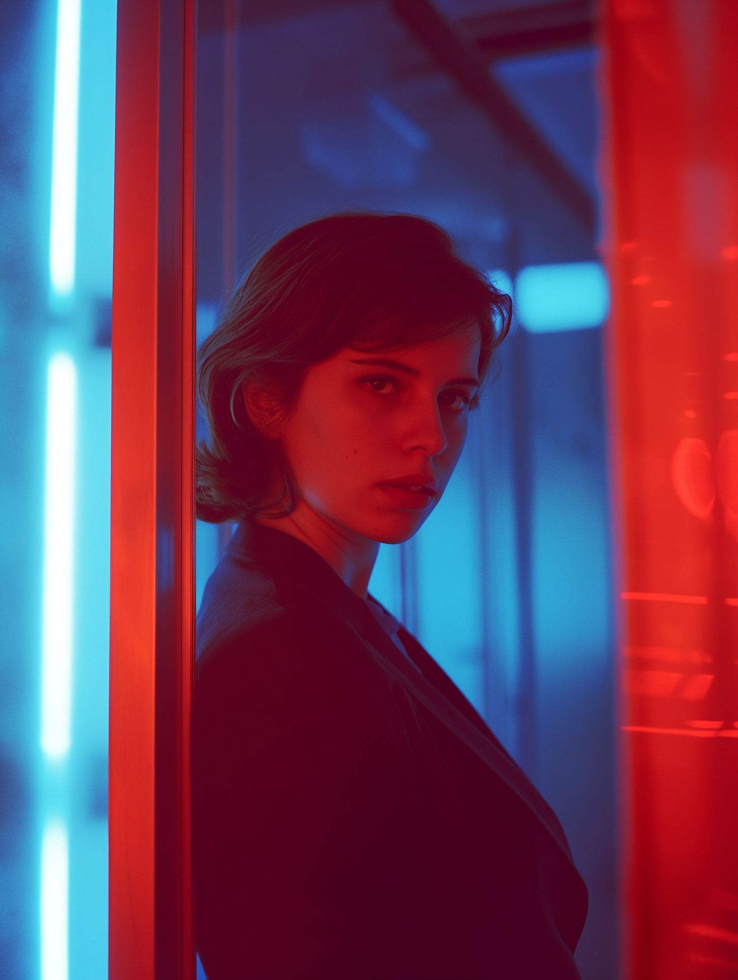 A woman stands between blue and red lights, creating a dramatic contrast. Her serious expression adds intensity to the scene.