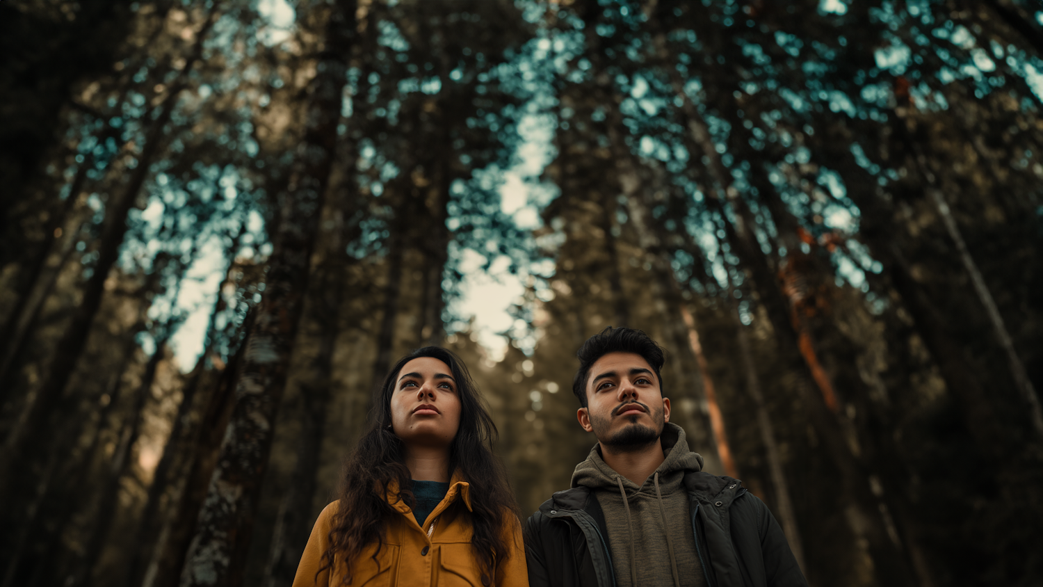Young couple in a serene forest, gazing thoughtfully amidst towering trees and dappled sunlight.