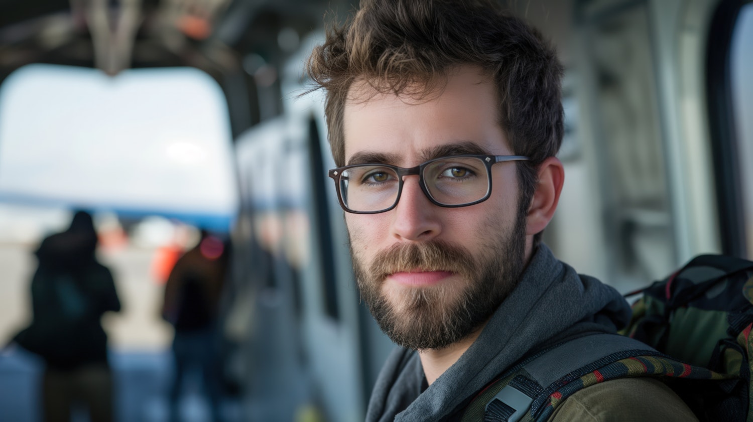 Caucasian man with glasses and a backpack in a transit area, wearing a gray hoodie. Blurred background with indistinct figures.