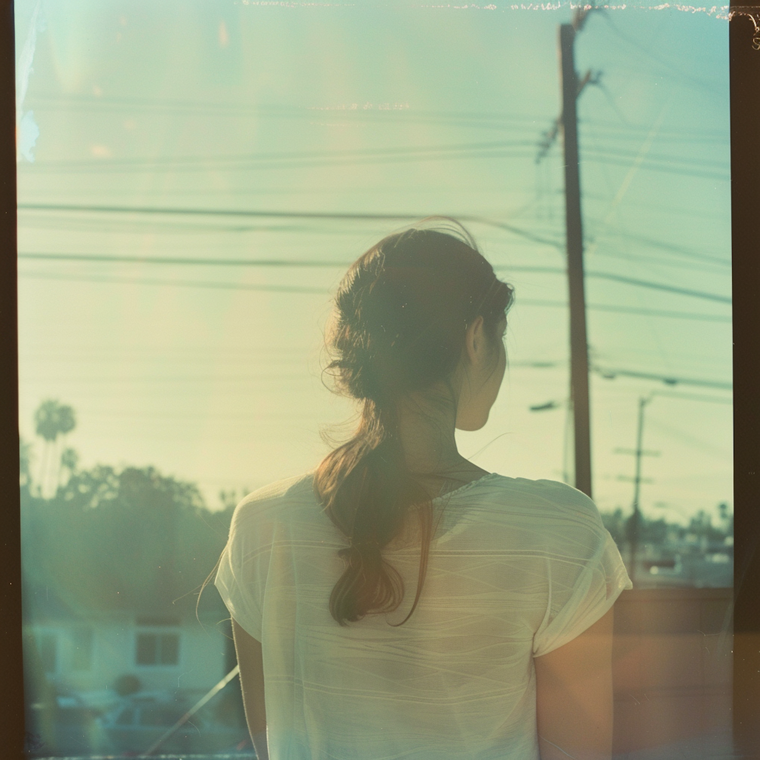 A woman with a ponytail gazes over a sunlit urban landscape, evoking nostalgia and serenity in a warm, dreamy glow.