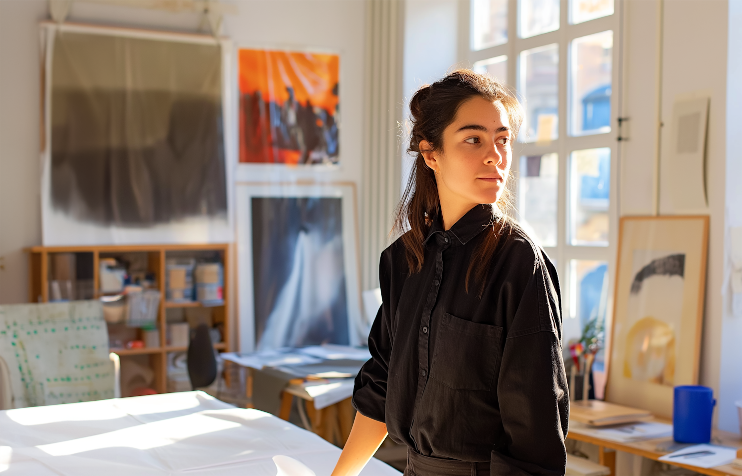 Young woman in a sunlit art studio, surrounded by abstract paintings and art supplies, gazing thoughtfully out the window.
