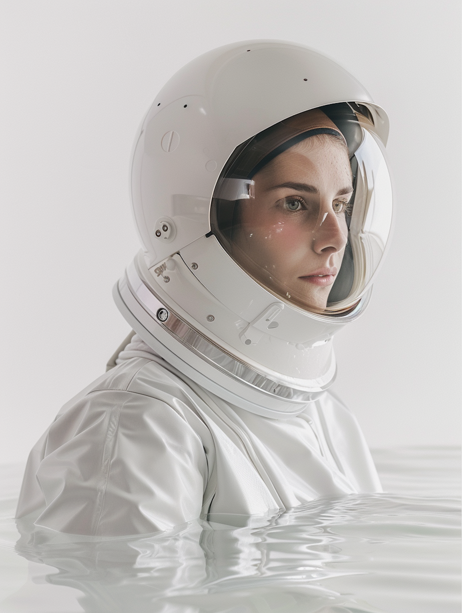 Woman in astronaut suit partially submerged in water, gazing thoughtfully. Soft lighting and serene atmosphere.