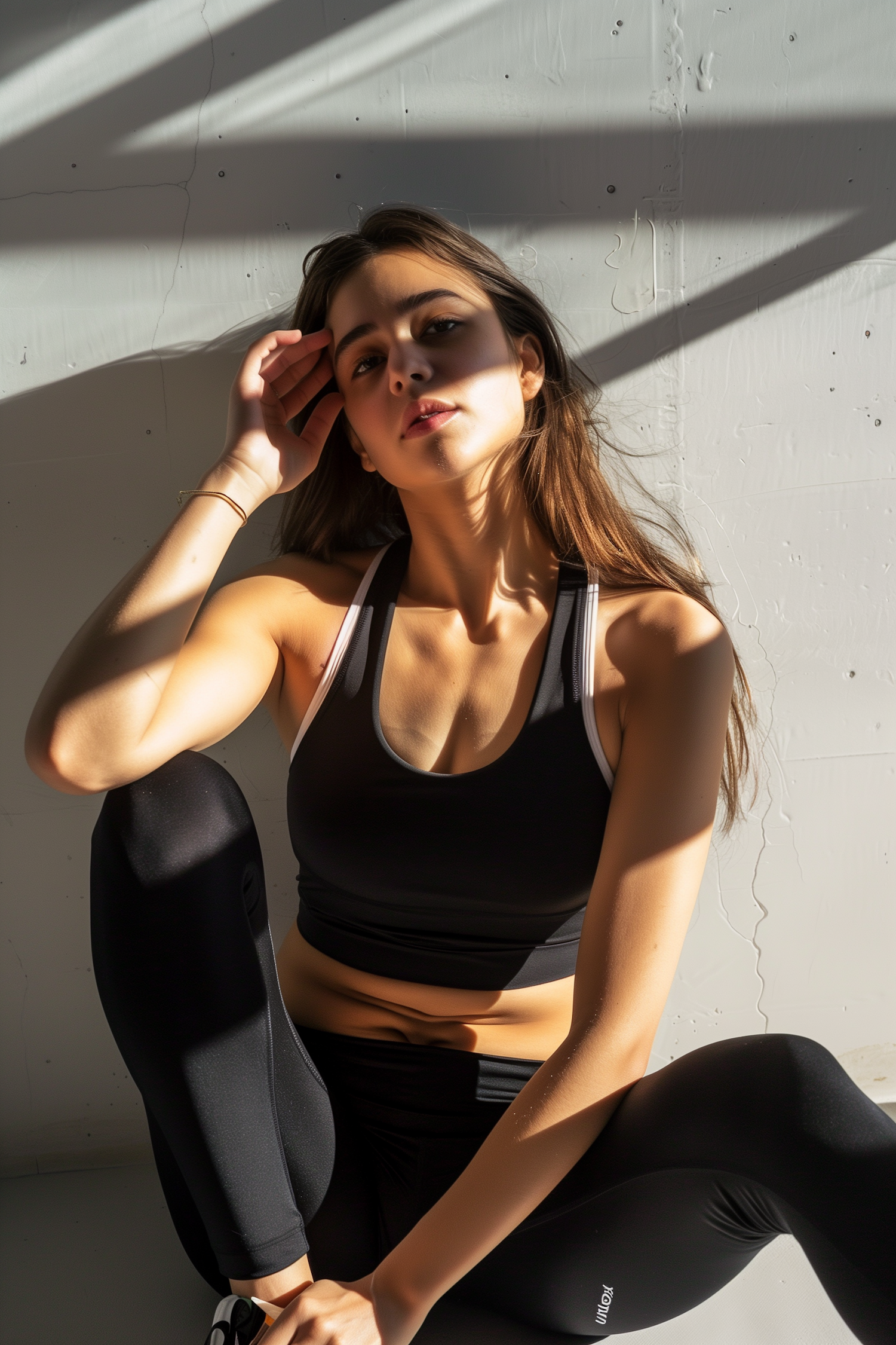 Young woman in athletic wear sits in dramatic sunlight, casting shadows on her face, creating a contemplative and introspective mood.