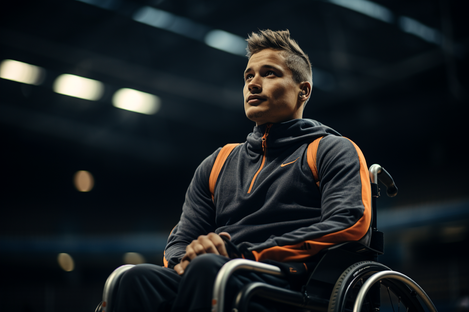 Young man in a wheelchair wearing a gray and orange hoodie, looking determined in a sports arena setting.