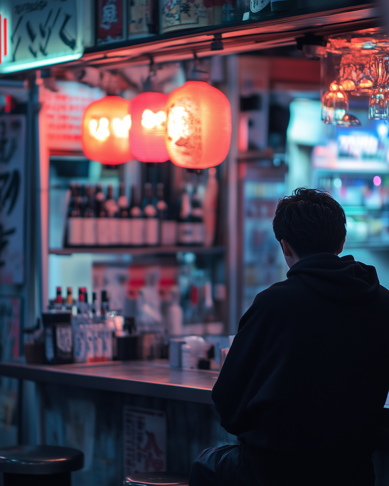 A solitary figure in a black hoodie sits at a dimly lit bar with red lanterns, creating a moody, reflective atmosphere.