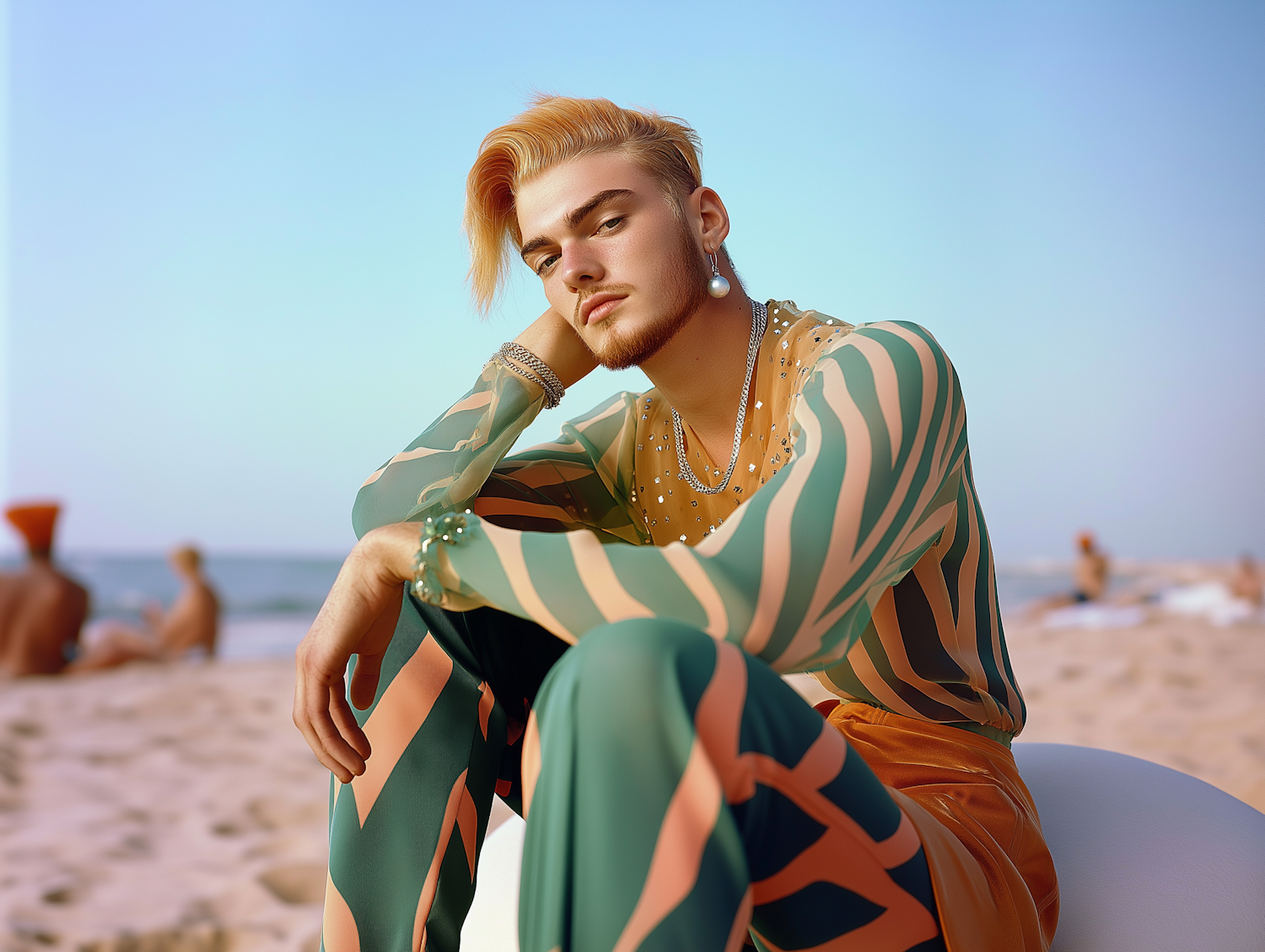 Stylish young man in green and orange striped outfit on a sunny beach, exuding confidence and elegance with unique accessories.
