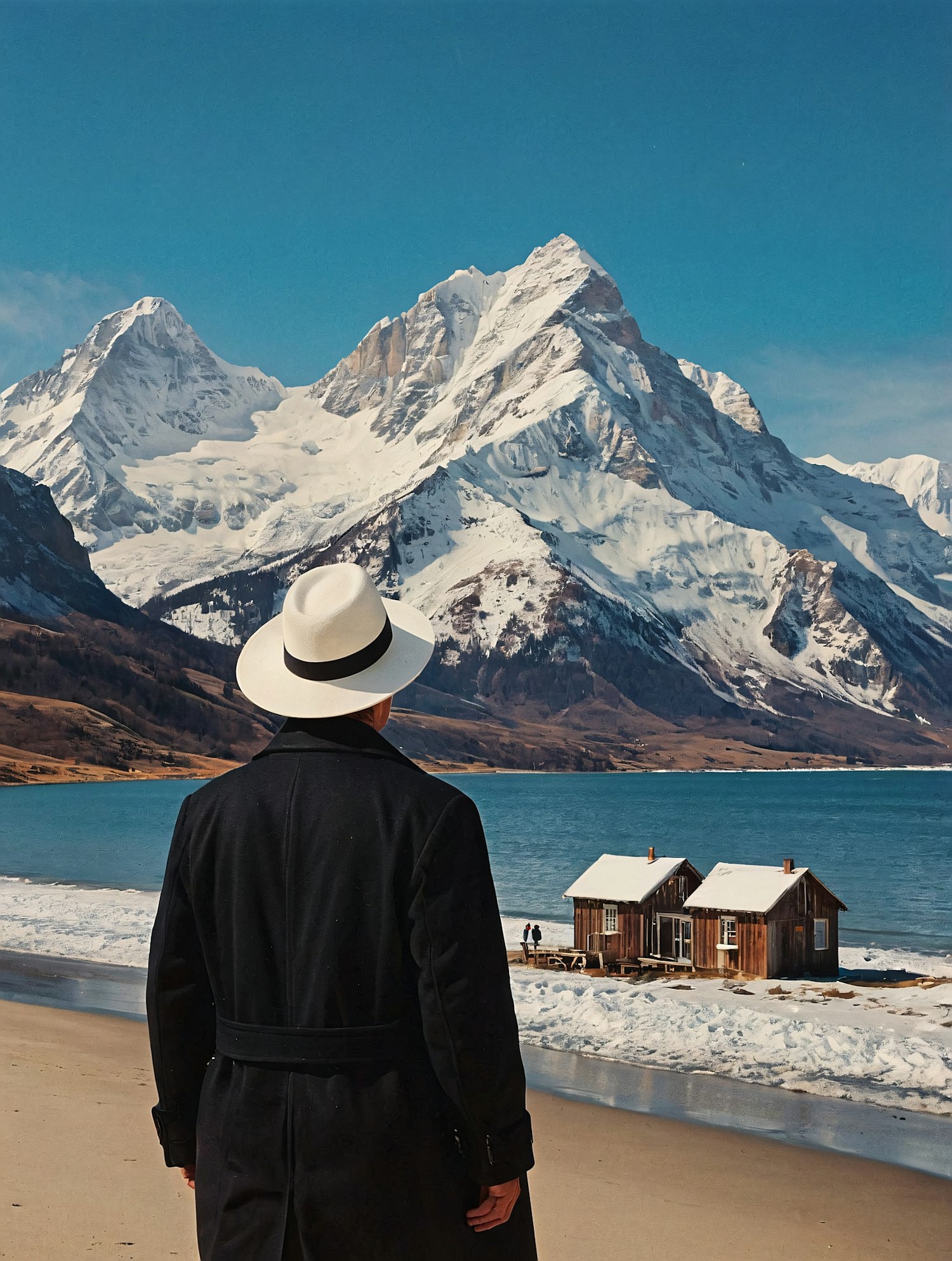 Person in black coat and white hat stands on beach, overlooking snowy mountains and wooden cabins by a turquoise lake.