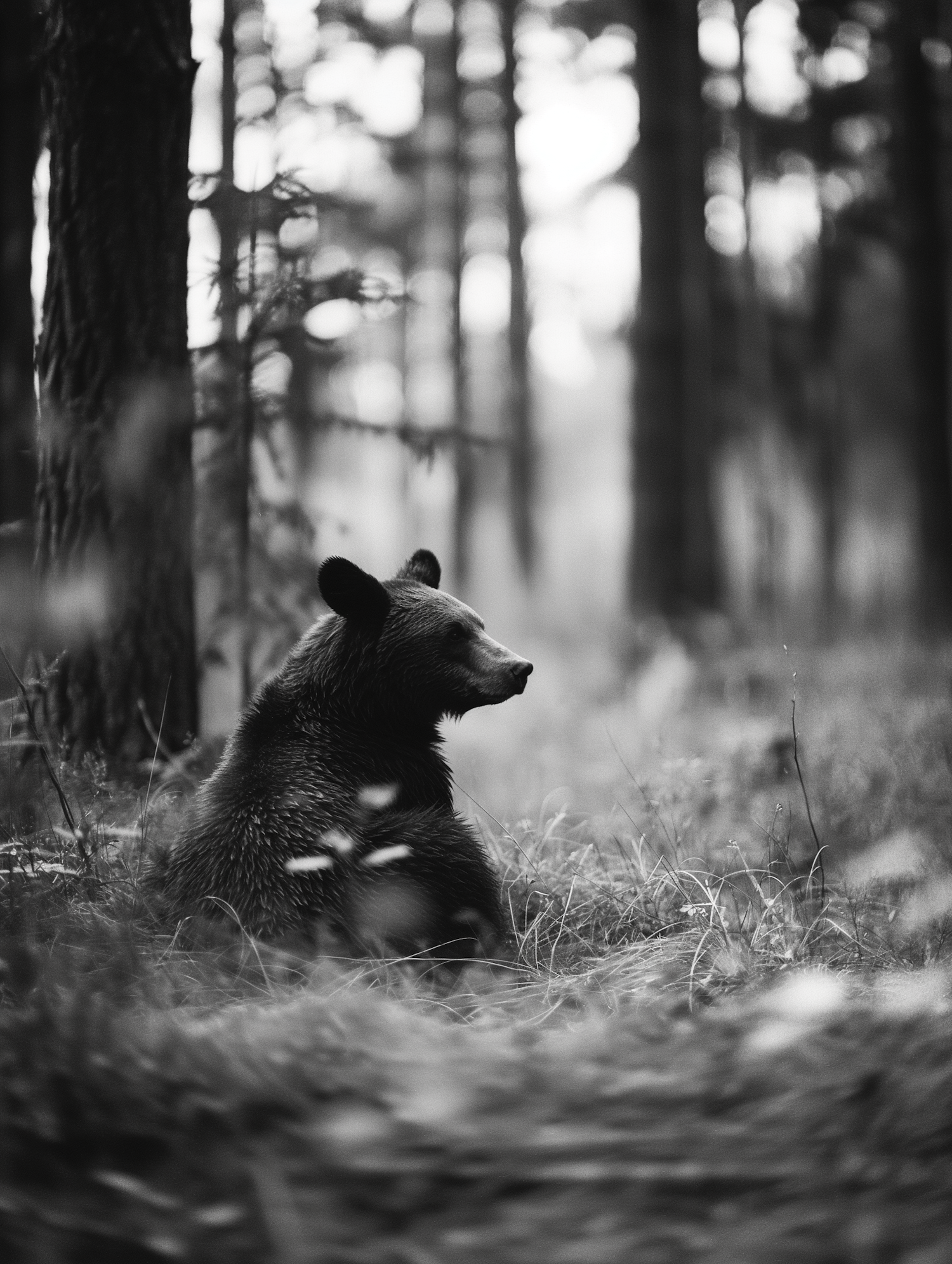 Black and white photo of a bear sitting in a serene forest, surrounded by blurred trees and grass, creating a tranquil atmosphere.