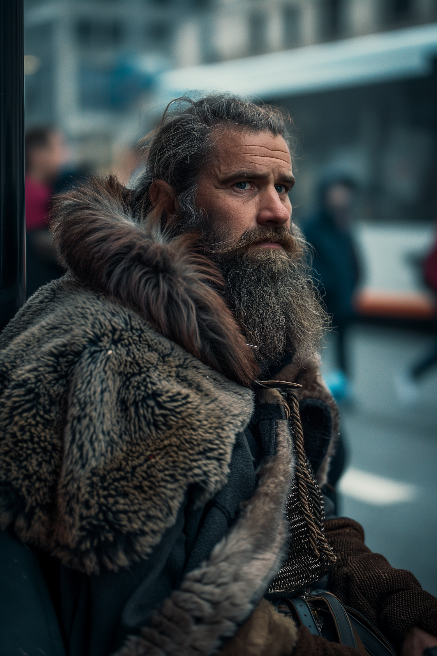 A rugged man in fur-lined cloak and chainmail stands in a city, blending historical and modern elements.